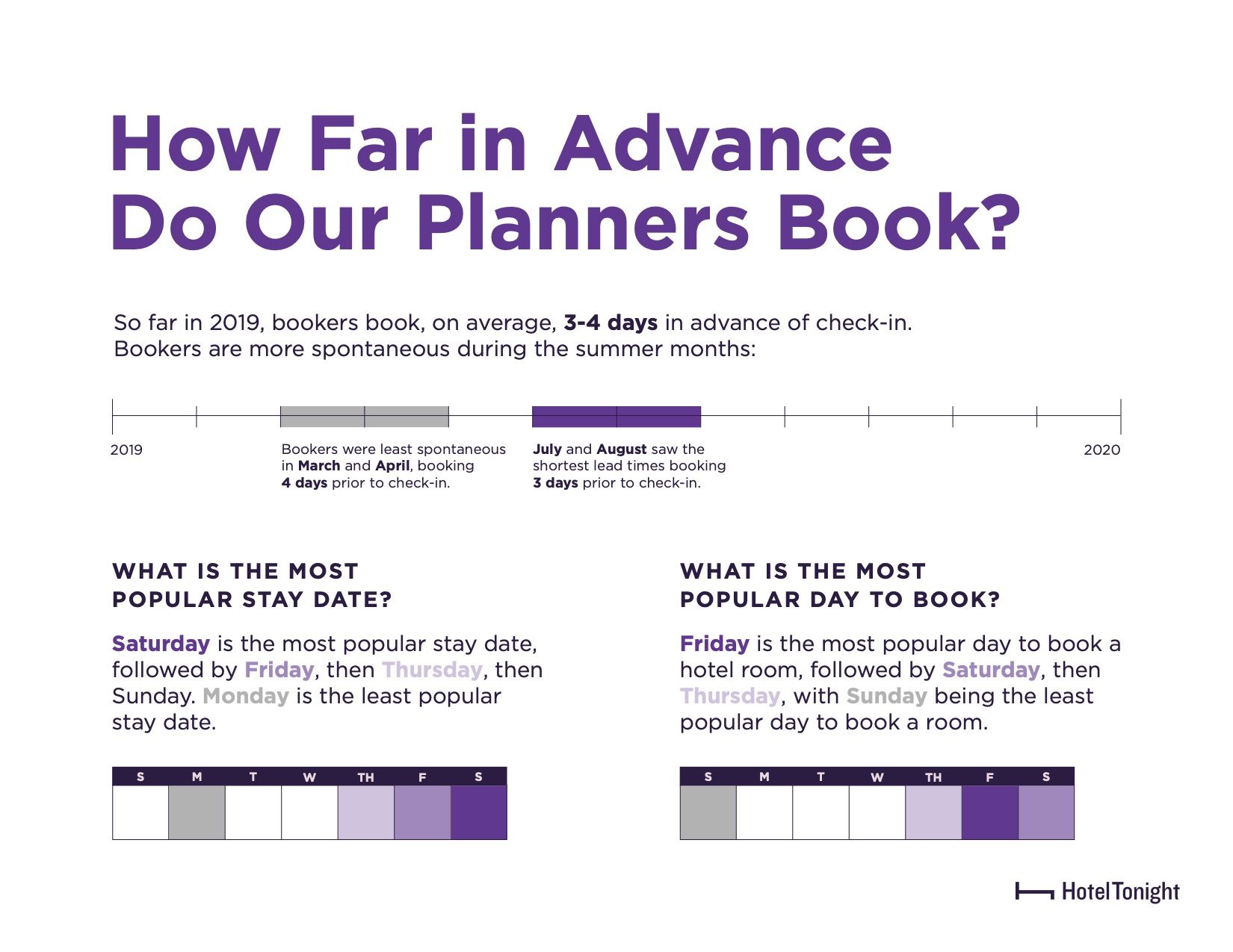 • On average, in 2019, HotelTonight travelers booked their hotel stays 3-4 days in advance of check-in.