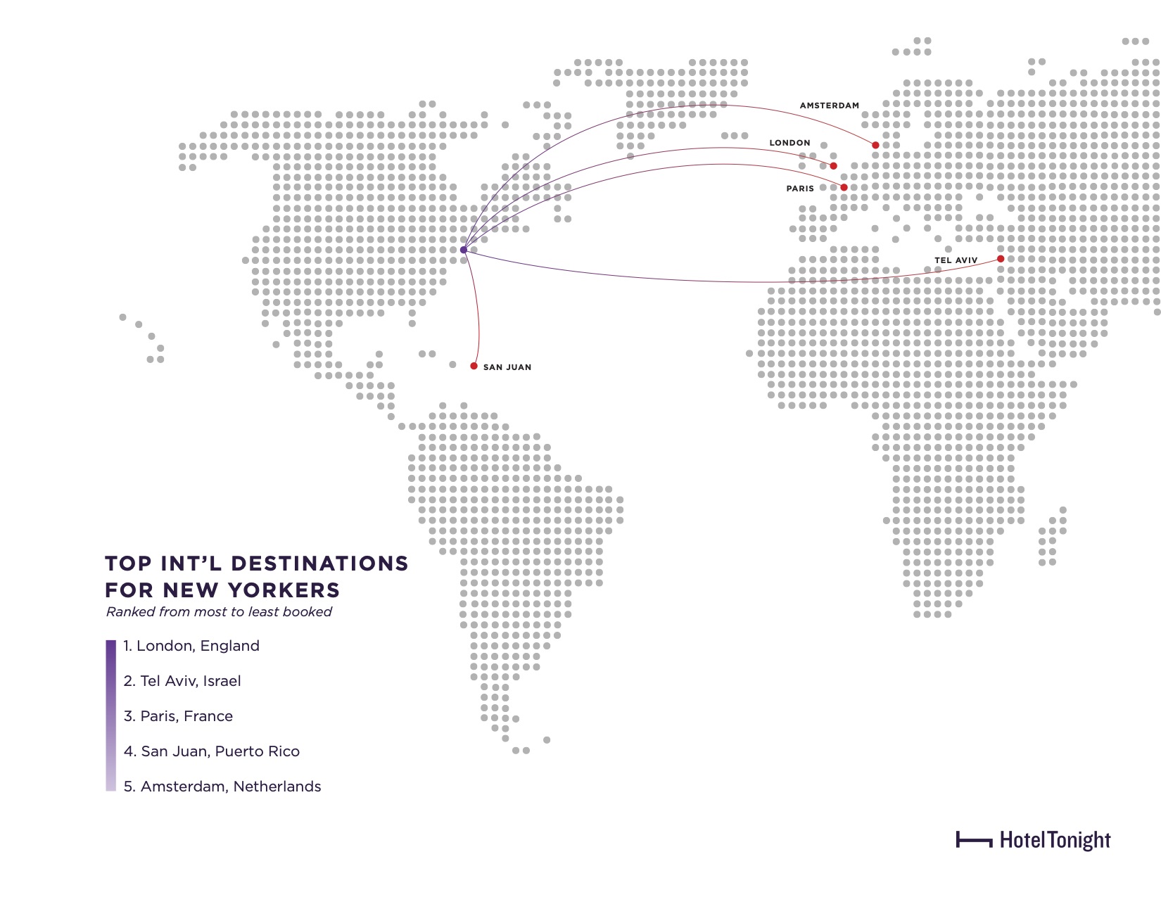 London, England was the #1 most-booked international destination on HotelTonight for both New York and Los Angeles. Paris, France was another destination favorited by Los Angelenos (#2) and New Yorkers (#3) alike.