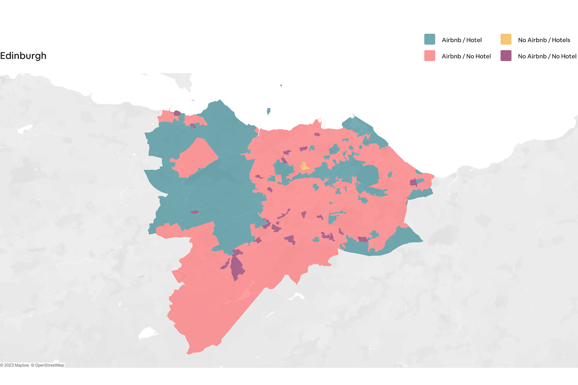 - In Edinburgh, the average daily rate of stays in communities served by Airbnb and no hotels was around $155 compared to $211 in communities served also by hotels.