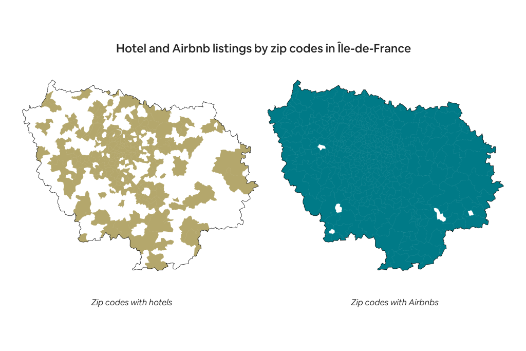 The positive impact of Airbnb on dispersing guests and travel benefits beyond hotel hotspots is seen not only in cities but for popular tourist regions too. In France’s most populous region, Ile-de-France, hotel supply was concentrated in half of the zip codes while Airbnb hosts offered accommodation in 99 percent of the zip codes, according to an analysis by Deloitte. The research also found that hotels tended to concentrate in areas with higher density and more economic activity while Airbnb covered a wider geographic area as shown in the comparison below.