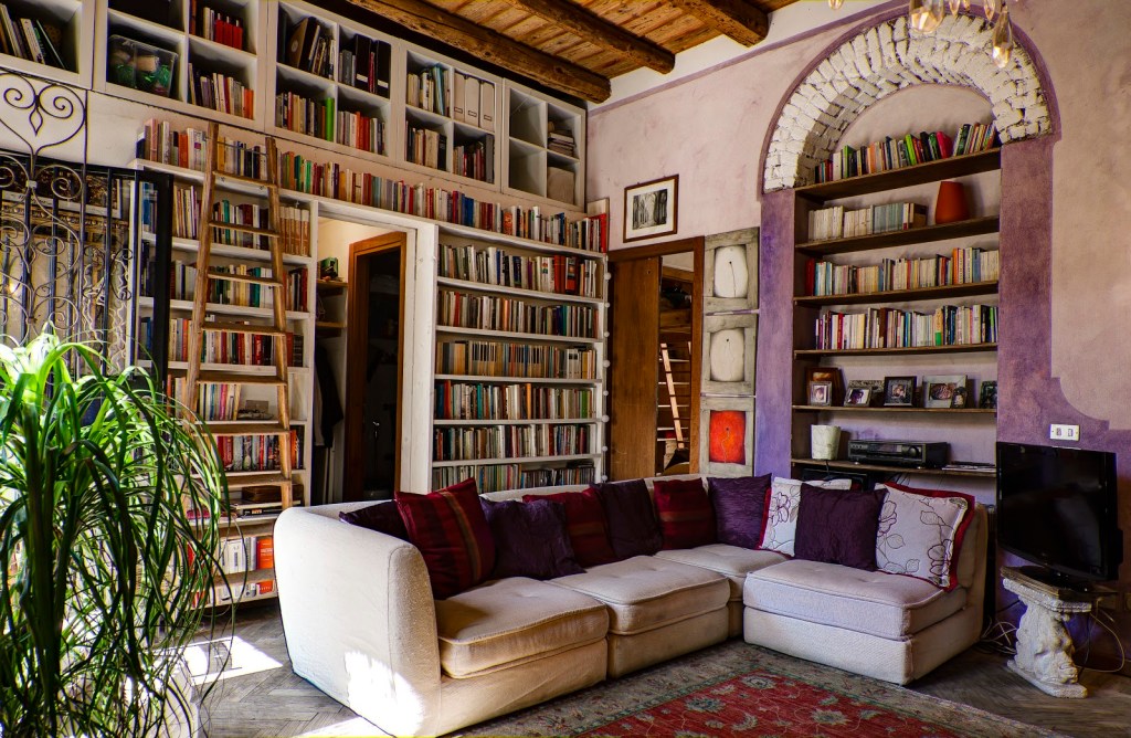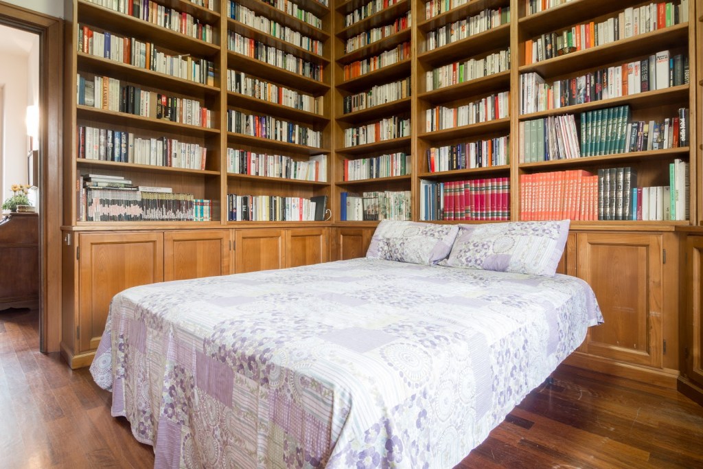 Sogni d’oro e ricchi di fantasia aspettano gli ospiti di Villa Flavia, in Umbria. Qui le pareti della camera da letto padronale sono totalmente coperte da una libreria in legno a muro dove trovare libri per davvero tutti i gusti!