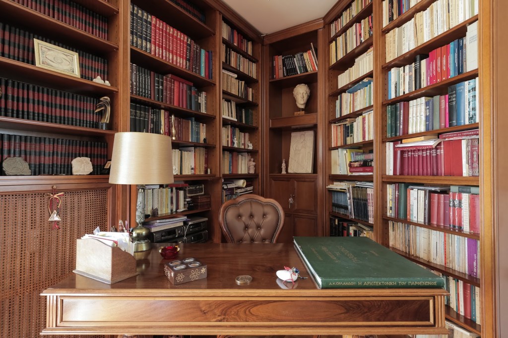 Uno scorcio del soggiorno della casa di Ira ad Atene, con angolo-studio per concentrarsi e perdersi tra le pagine della sua nutrita libreria.