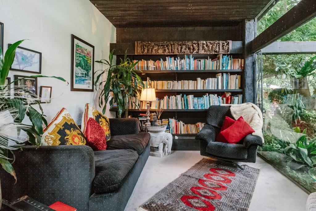 Un posto magico arredato con cura dal proprietario con mobili e opere d’arte collezionate nei suoi viaggi intorno al mondo. Qui trova spazio la libreria con vista su un giardino lussureggiante, un rifugio nel verde dove rilassarsi circondati da arte, letteratura e natura.
