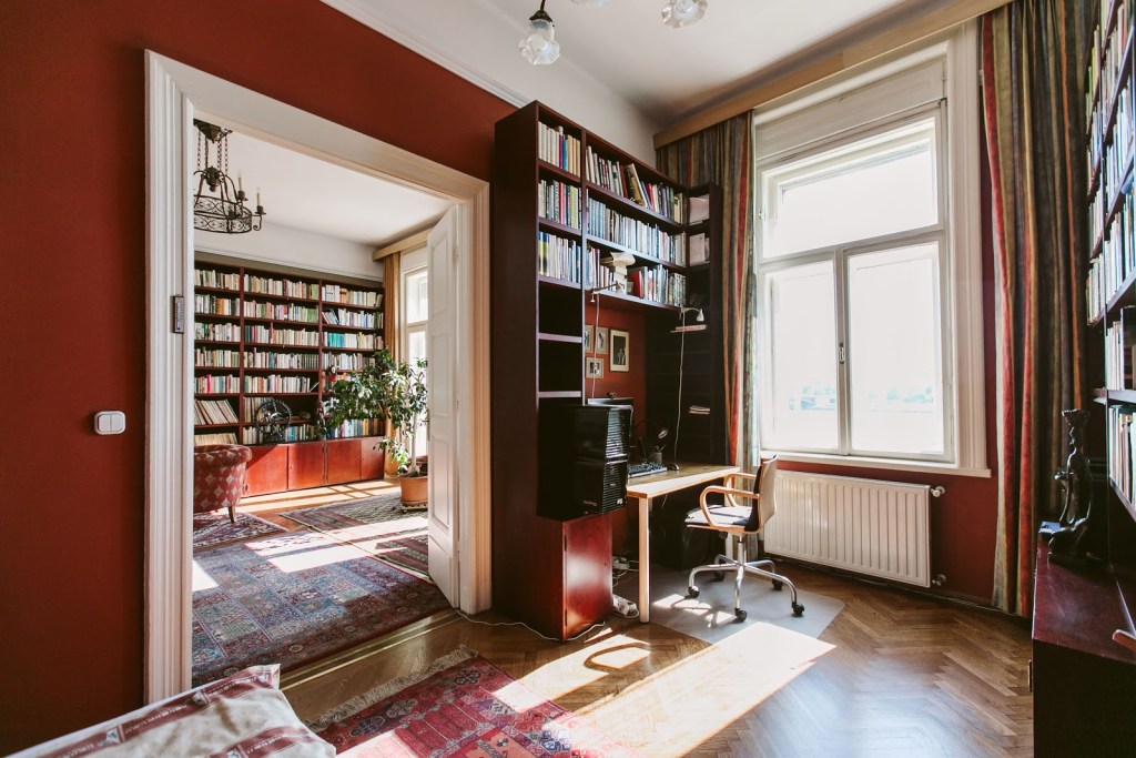 Un appartamento di classe affacciato sul Danubio con vista panoramica su Budapest. Dalle ampie finestre la luce naturale filtra nel salotto creando l’atmosfera perfetta per immergersi nella lettura.