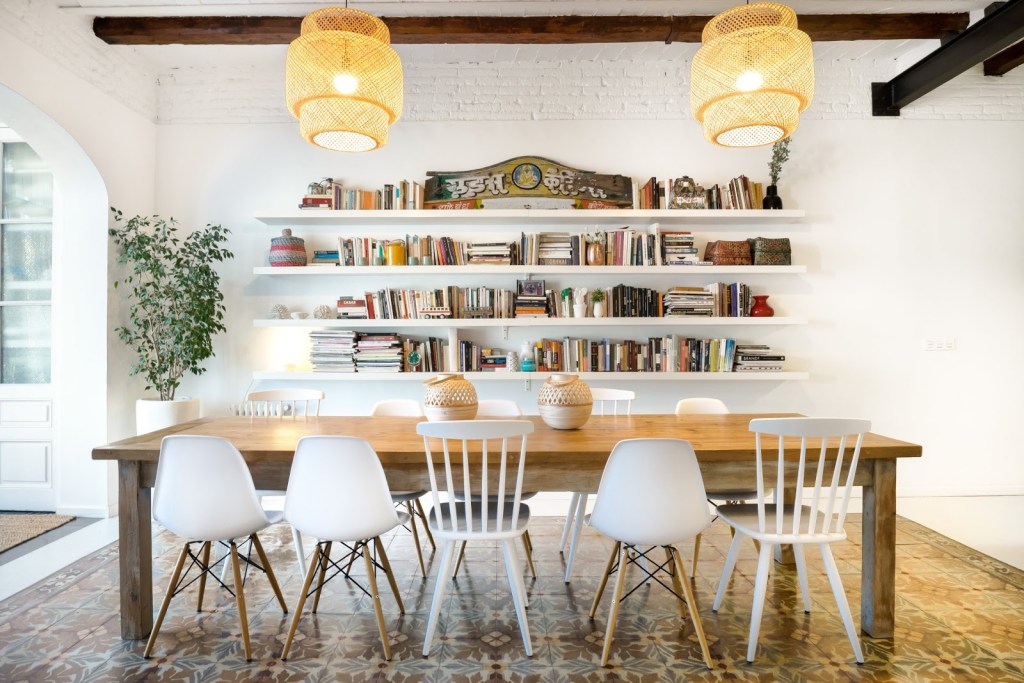 Più minimalista, questa casa Airbnb Plus a Barcellona sfrutta la libreria come elemento d’arredo della zona giorno. I libri sono in questo caso il tocco di colore che mancava in una casa dove domina il bianco.