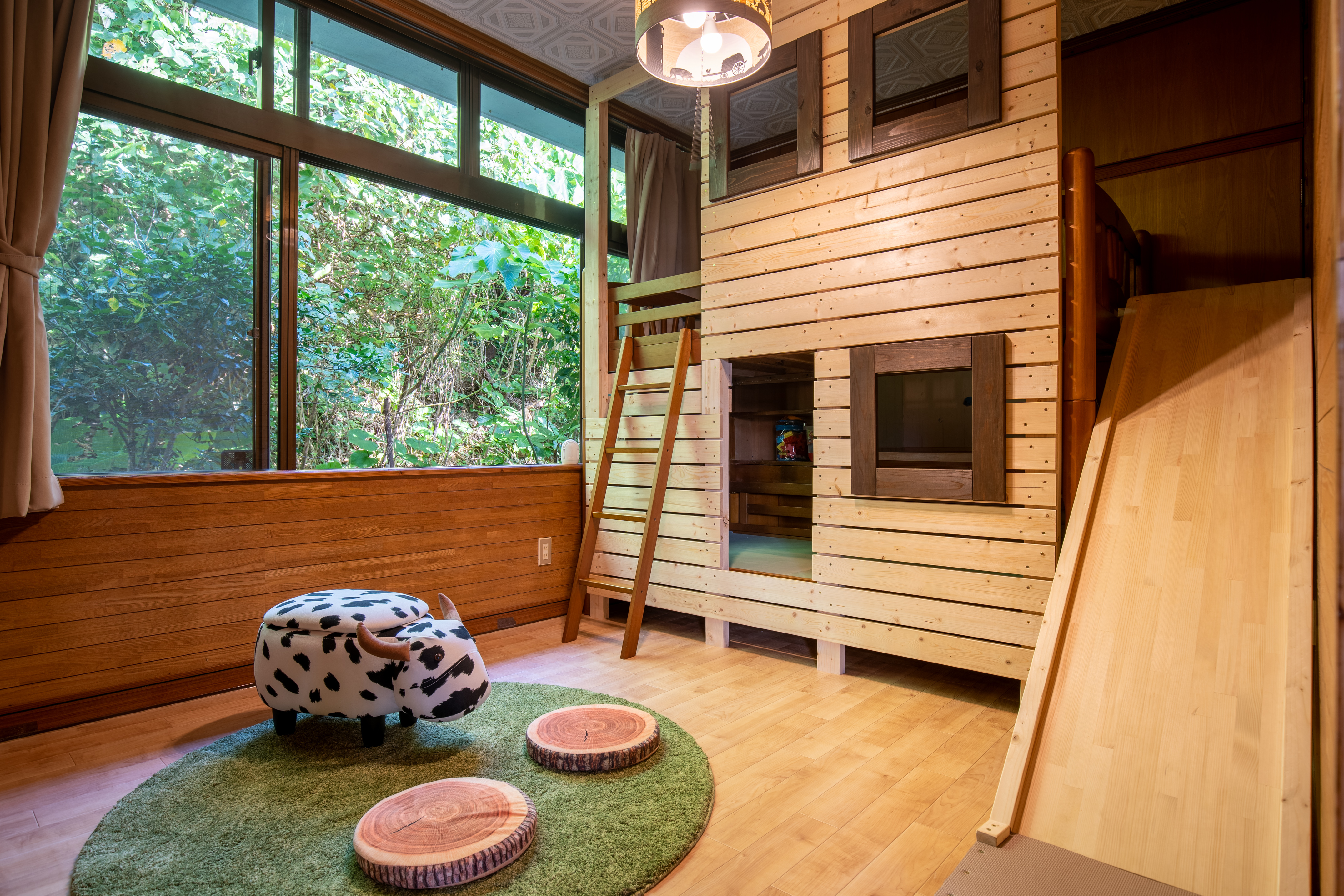 Volete trascorrere del quality time con qualcuno che amate? Date un’occhiata alla categoria Spazi per Giocare, in cui potete trovare alloggi con aree perfette per divertirvi insieme ai vostri cari, come questo alloggio a Okinawa, in Giappone, con una stanza dedicata interamente al gioco con una casetta di legno e scivolo a due piani.