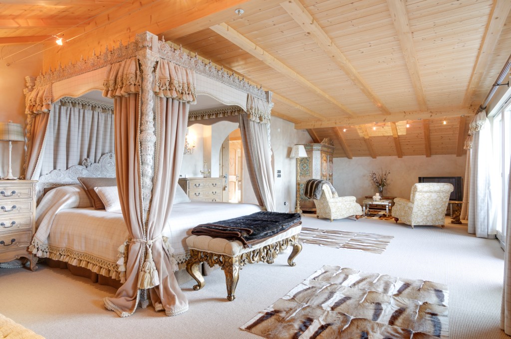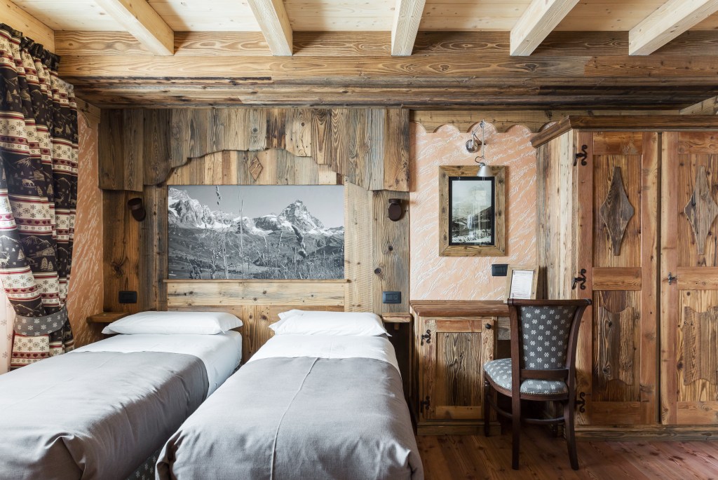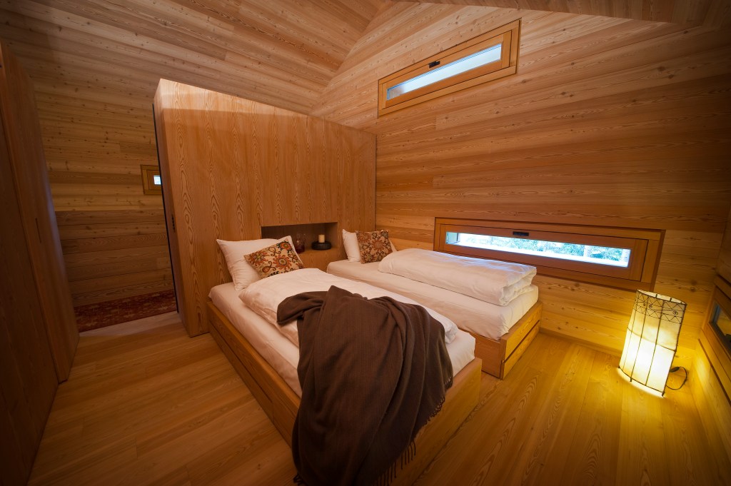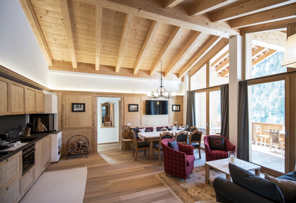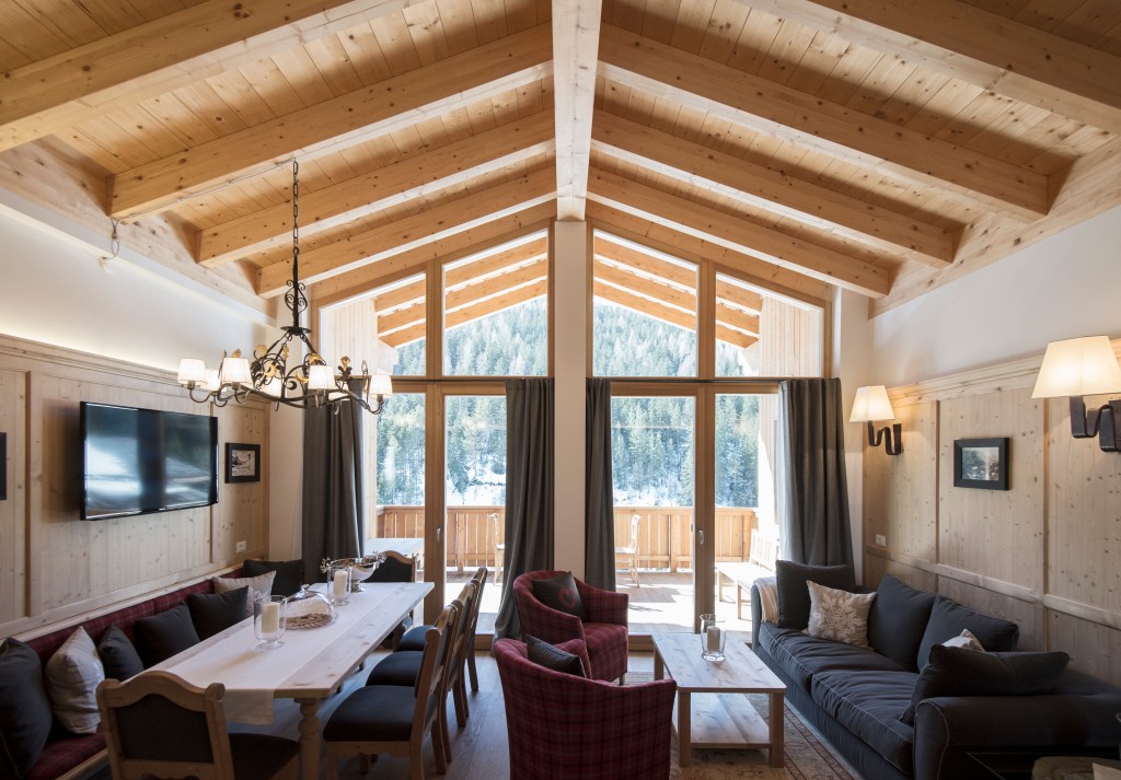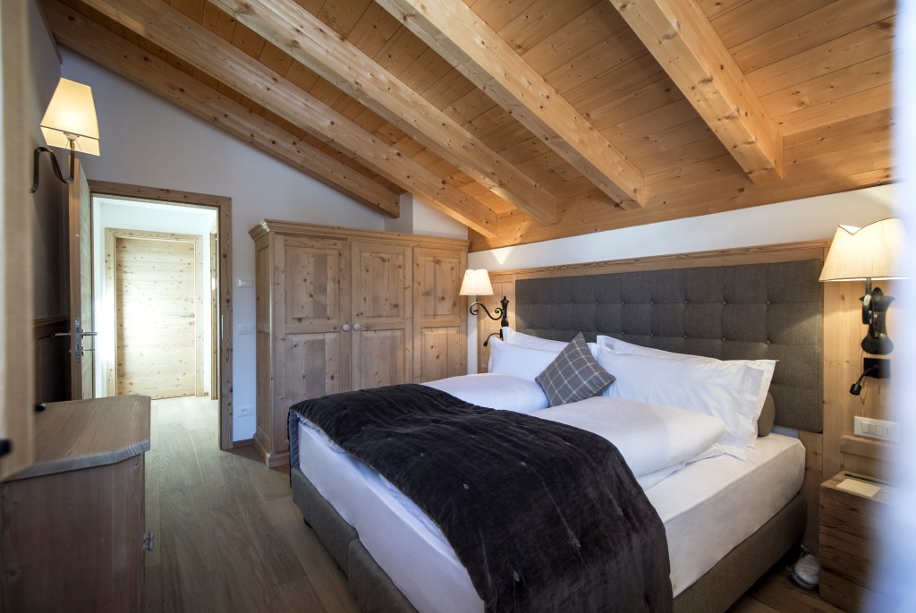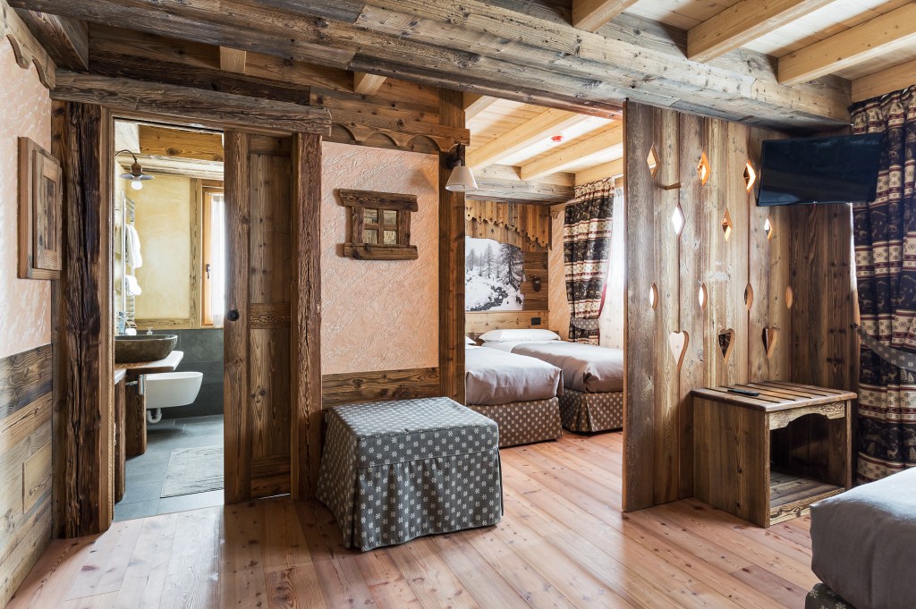 Una camera matrimoniale, due camere singole e una stanza padronale con bagno privato dotato di vasca e doccia hammam. Il tutto con una vista mozzafiato sui boschi di larice.