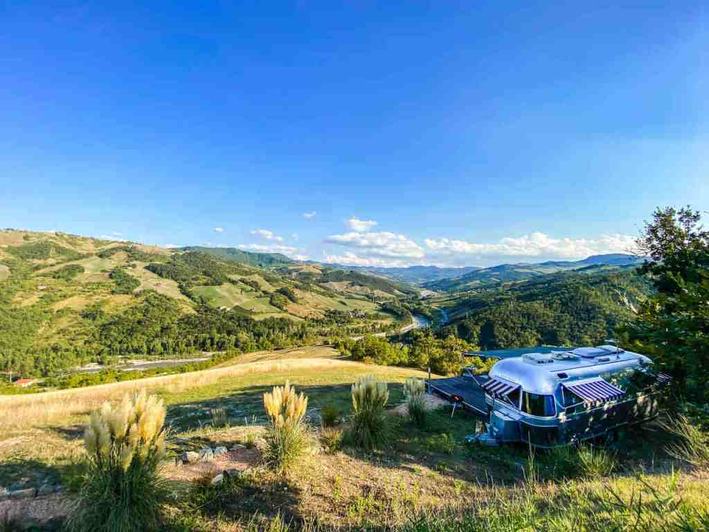 Questo luogo incantato si trova fuori Bologna, sulle rive del fiume Panaro. Qui Ruth e Paul hanno trovato la location ideale per il loro airstream, dotato di ogni servizio per trascorrere una una notte estiva sotto il cielo stellato.