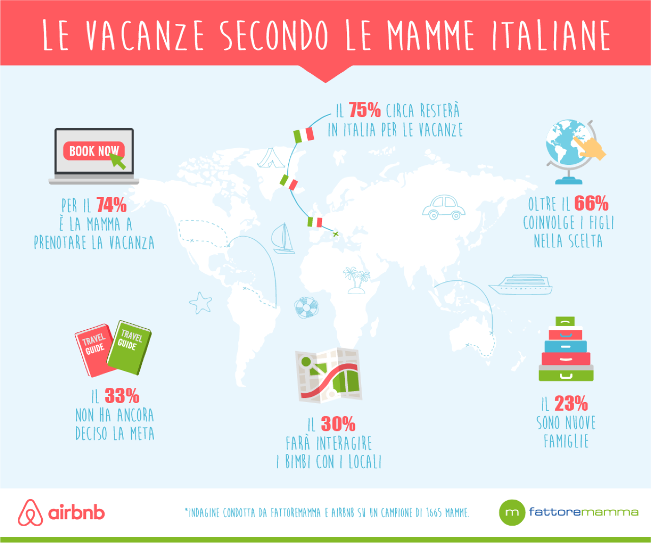 Vacanze in famiglia per staccare la spina? Bisogna – nemmeno a dirlo –  ringraziare la mamma: 3 volte su 4 è lei a pensarci e organizzare il viaggio. Che se ne occupi già a Carnevale oppure a scuole finite, la domanda cruciale (“Dove andiamo quest’anno?”) è inevitabile. E se il rito della vacanza si perpetua, qualcosa è cambiato: oggi il parere dei più piccoli è sempre più importante (67% del campione), così come cruciali sono la consapevolezza delle esigenze della famiglia allargata e il ruolo dei social network che hanno soppiantato la vecchia cartolina. E’ quanto emerge da una ricerca condotta da Airbnb e Fattore Mamma su un campione di 1.426 mamme italiane, che ha indagato i programmi delle famiglie per la prossima stagione estiva, scoprendo alcune nuove tendenze e anche qualche inossidabile conferma.
