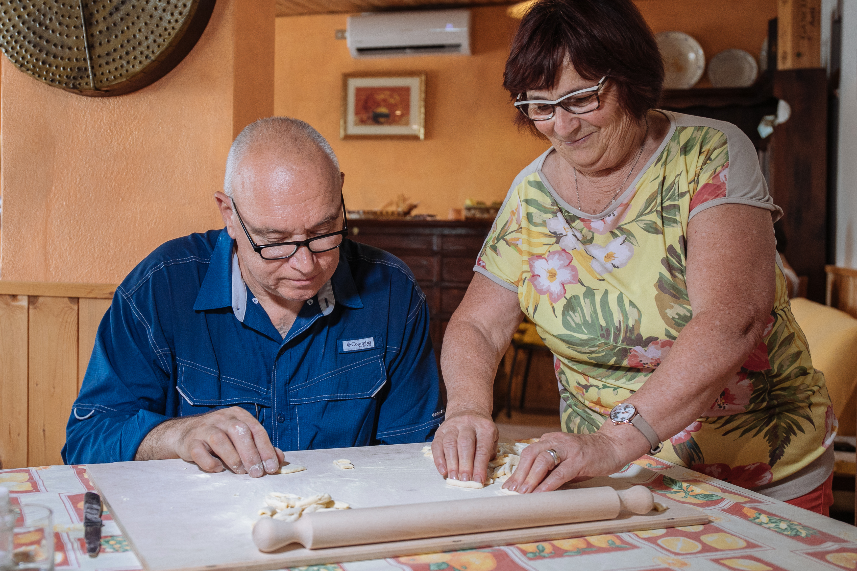 Grottole è situata su una collina a 48o m sul livello del mare e ai piedi di essa si trova la casa di Enza. Ha riunito i volontari intorno al tavolo della sua cucina e lavora velocemente la farina e l’acqua, impastando con amore sotto gli occhi attenti e incantati dei volontari. Subito anche loro iniziano a lavorare alla loro versione, aggiungono farina, acqua e iniziano a tagliare l’impasto in piccole parti. Usando due dita, piano piano, creano le famose orecchiette.
