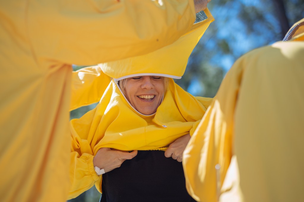 Sono le 10 di un caldo mercoledì mattina e Rocco – barbiere e apicoltore di Grottole – mostra al gruppo le sue arnie. Le cassette multicolore sono posizionate una accanto all’altra parallele ad una fila di alberi di eucalipto, che danno un particolare sapore al miele prodotto proprio lì. Estrae un telaio dall’arnia, lo espone alla luce del sole e i volontari incantati prendono del miele direttamente con le loro mani.