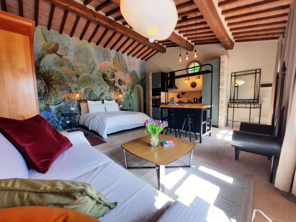 mmerso tra le colline della Val di Chiana, Gli Sterpi è un fienile in pietra finemente restaurato che unisce il fascino tipicamente toscano ai comfort moderni. Circondato da ulivi e boschi, la proprietà mette a disposizione un accogliente alloggio di 40 m² con camera da letto, bagno, cucina attrezzata con isola e soggiorno.