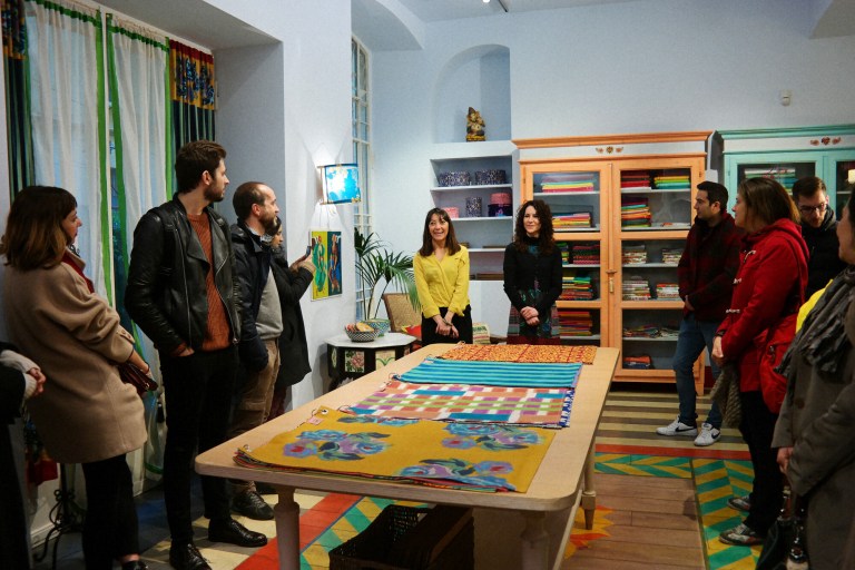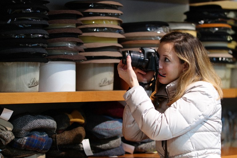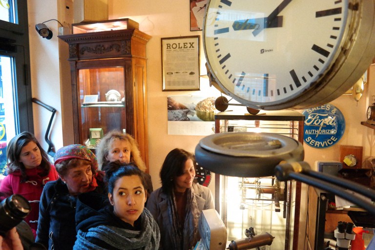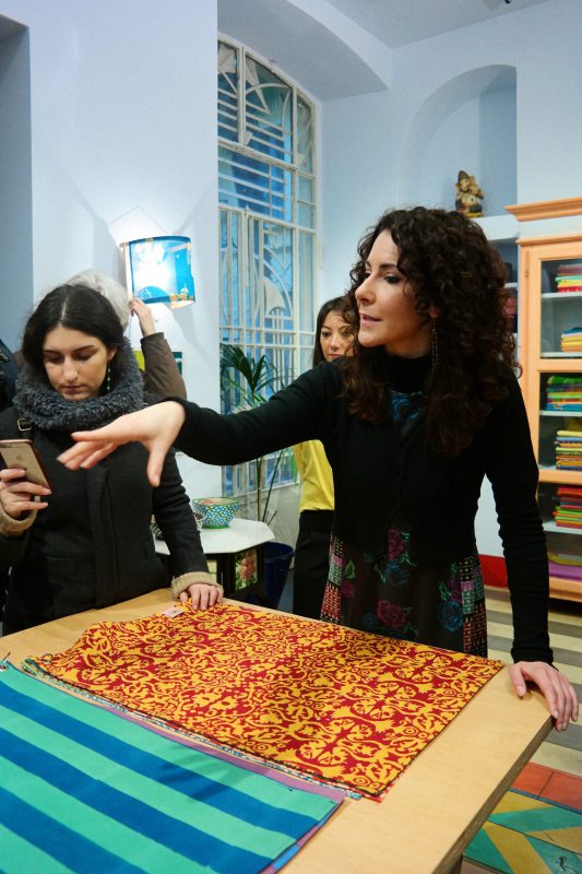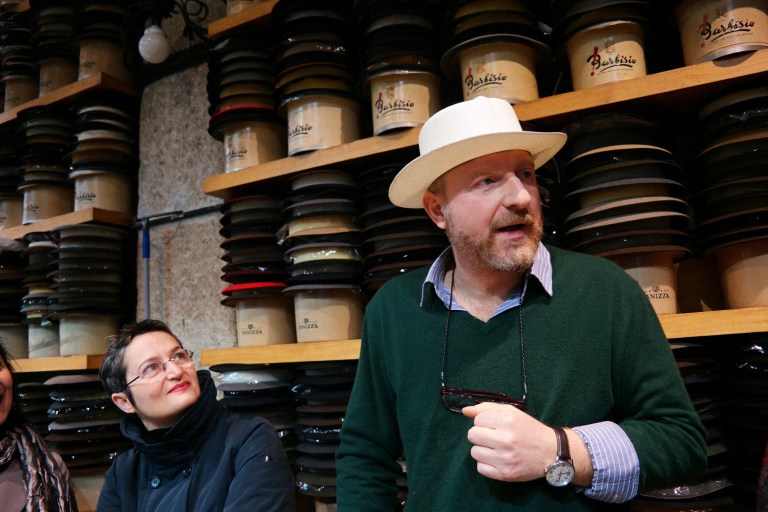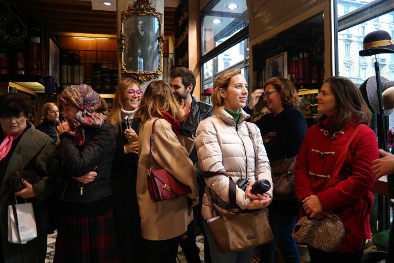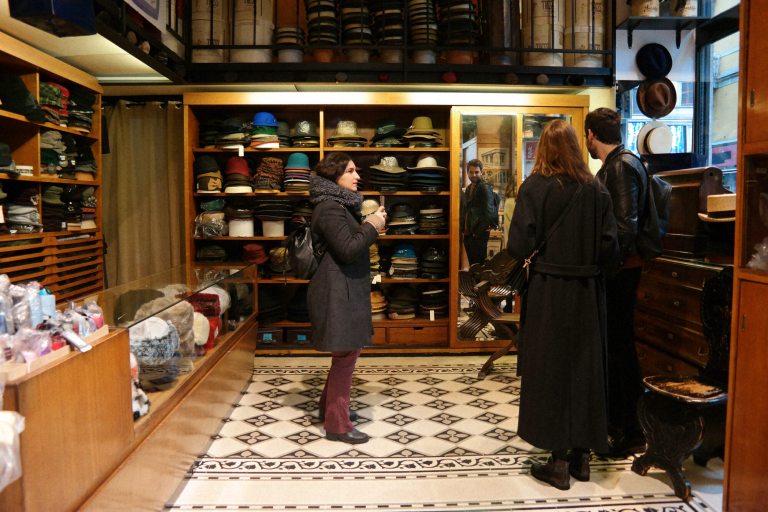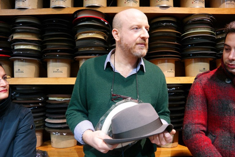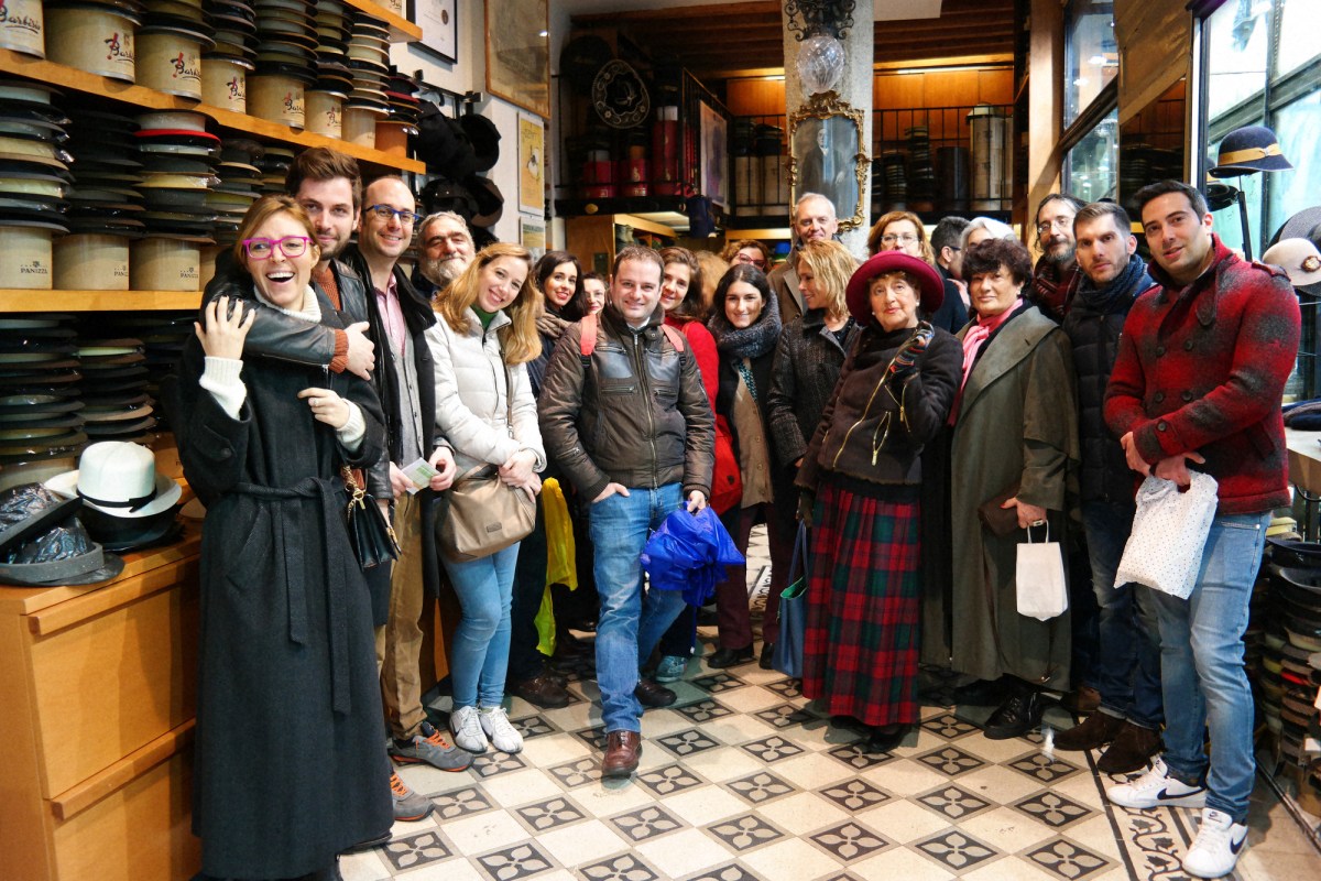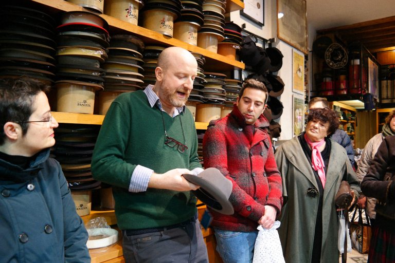 Mutinelli è la più antica cappelleria di Milano, fondata nel 1888, quando corso Buenos Aires, una delle arterie commerciali principali della città, era ancora tutta campagna. Il pavimento che si calpesta, una volta entrati, è ancora quello dell’epoca, con tutto il fascino di essere passato indenne a 130 anni di storia (incluso il bombardamento di Milano della Seconda Grande Guerra). A fondarla il bisnonno dell’attuale proprietario, Matteo Mutinelli, erede di un mondo, quello del commercio del cappello, che è molto cambiato. “Un tempo la cappelleria era come un negozio di scarpe, ci si recava spesso. Indossare il cappello era una formalità, era dovuto. I cappellai facevano l’economia di Monza e di Milano e molti industriali dell’epoca sono nati facendo i cappellai. Oggi, invece, si lavora molto su pubblici di nicchia, il cappello è diventato un oggetto prezioso”, ha spiegato agli host, che hanno indossato berretti e panama. E qualcuno ha anche fatto un acquisto per il suo compleanno!