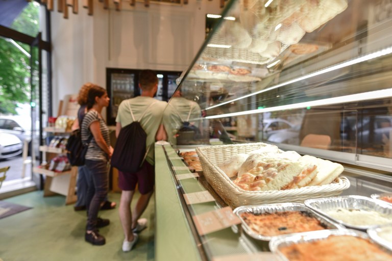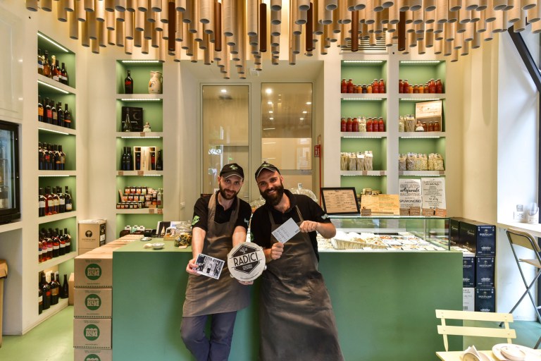 Lo scorso anno Davide e Andrea, l’uno comunicatore, l’altro illustratore, hanno ripreso in mano gli spazi della vecchia pizzicheria romana di via Emanuele Filiberto 38, aperta negli anni Sessanta e chiusa negli anni Novanta, per creare un negozio che raccogliesse tutto il buono della loro terra d’origine, Lecce e il Salento, in Puglia. “Abbiamo portato le nostre radici in un rione che ha tanti colori, nella città che abbiamo scelto fin da quando eravamo studenti”, ci hanno spiegato. La pizzicheria è la tipica bottega romana in cui si vendono formaggi, prodotti speziati, salumi. Loro propongono rustici e focacce, vini e passate di pomodoro, caffè. I sapori del Sud Italia. Il soffitto del negozio ricorda la chioma di un albero, sotto cui sostare; il nome del negozio, “Radici” racconta il legame di questo luogo con il quartiere e il legame dei proprietari con la propria terra di origine. Un incontro positivo e originale.