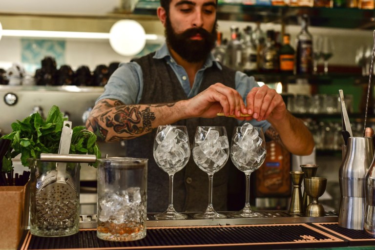 Piazza Vittorio è una piazza completamente porticata, con al centro un grande giardino, ed è unica nel suo genere a Roma. È il cuore dell’Esquilino, eppure sono diversi i negozi storici che nel tempo, anche a causa della crisi, hanno chiuso. Lo scorso anno però cinque ragazzi della zona hanno deciso di provare a portare un cambiamento nella piazza e si sono inventati il Gatsby Cafè. “Sentivamo di volerci occupare di un progetto per portare un cambiamento nel nostro quartiere. Ci siamo detti: ognuno tiri fuori un’idea” ci ha raccontato Mauro, uno dei soci. Così negli spazi che per molti anni avevano accolto l’antica cappelleria Venturini, tolto il polveroso cartello “affittasi” dalla vetrina, hanno fatto sorgere un bistrot che ha mantenuto lo stile anni ’50 (e i cappelli!) della cappelleria, ma con uno sguardo internazionale, verso il nord Europa.