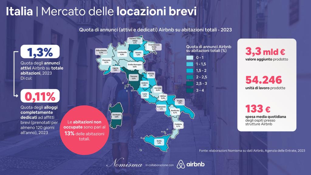 Un nuovo rapporto di Nomisma, commissionato da Airbnb, mostra come lo stock di abitazioni destinate agli affitti brevi non abbia eroso l’offerta abitativa a livello nazionale, se non in modo residuale, registrando al contempo come la situazione dei centri storici delle principali città d’arte, dove la pressione turistica è significativamente più elevata e la penetrazione delle locazioni brevi superiore alla media nazionale, risulti invece più delicata e giustifichi la necessità di intervenire con strumenti legislativi. Secondo lo studio, gli affitti brevi e il turismo in casa gestiti tramite Airbnb avrebbero contribuito all’economia italiana per 7,9 miliardi di euro di valore della produzione nel 2023, con un sostegno a oltre 54.000 posti di lavoro.