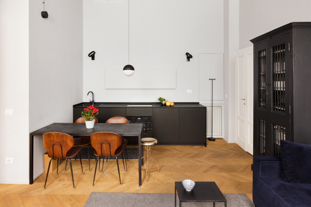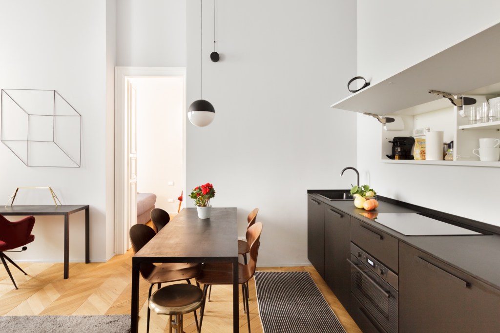 Sant’Ambrogio, uno dei quartieri più antichi e caratteristici di Milano, ospita questo appartamento che, dal fascino vecchia Milano, si apre al contemporaneo grazie alla scelta degli arredi e a dettagli scuri e geometrici.