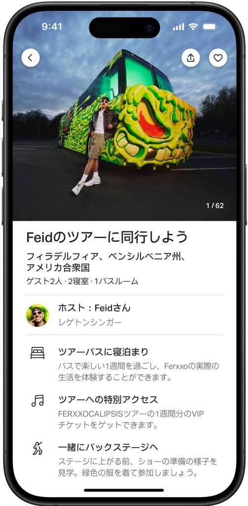 - Feidのツアーに同行しよう レゲトン界のスーパースターのFERXXOCALIPSISワールドツアーに1週間同行しましょう。クルーの一員となって、リハーサルに参加したり、ツアーバスに乗ったり、すべてのショーのバックステージにアクセスしたりできます。