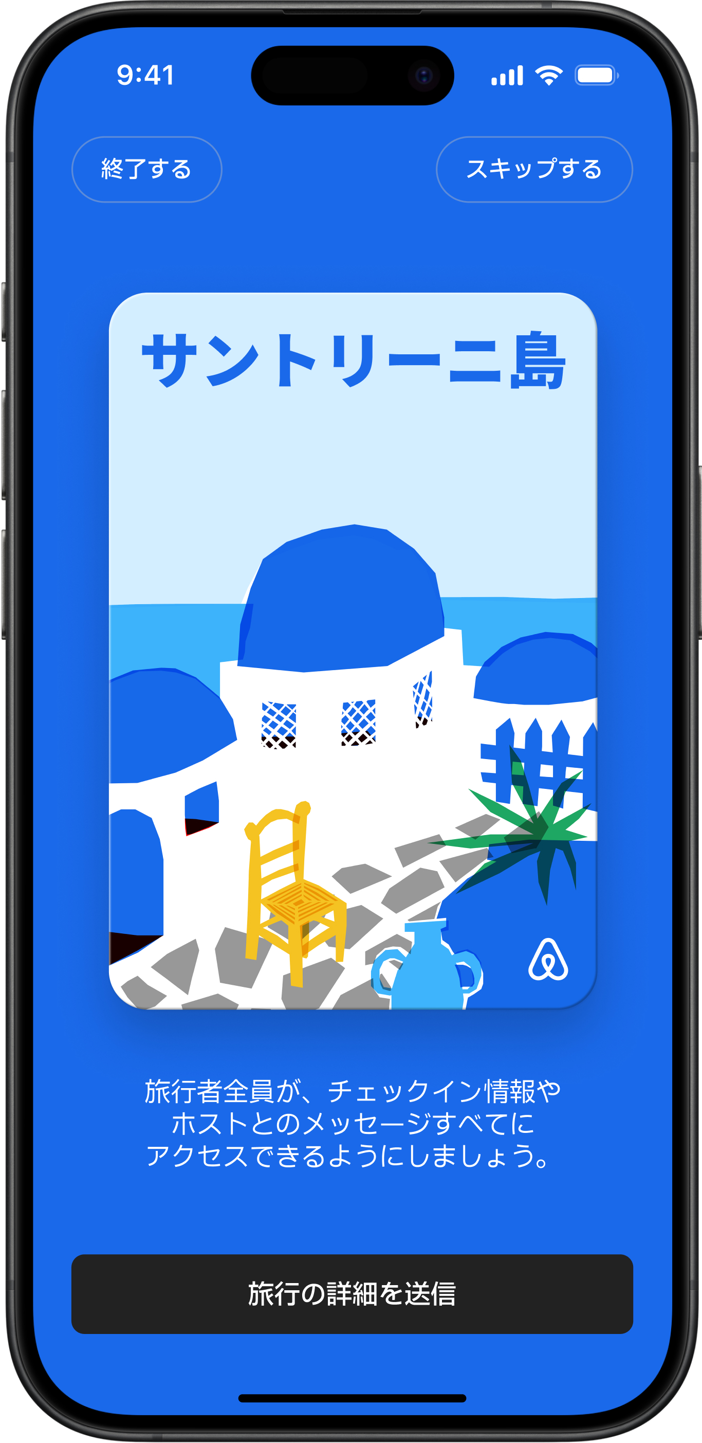 旅行の予約が完了したら、世界中のアーティストによって描かれた旅行先のデジタル絵はがきを添えて、一緒に旅行するゲスト全員を招待し、正確な住所、Wi-Fiパスワード、チェックイン手順など、すべての予約情報が共有できます。