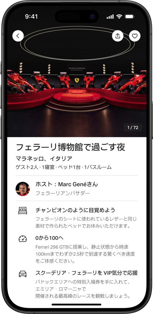 - フェラーリ博物館で過ごす夜 イタリアのマラネッロにあるフェラーリ博物館に滞在し、レースの世界を満喫しましょう。フェラーリのシートと同じ革で作られたベッドで眠り、スクーデリア・フェラーリのドライバーアンバサダーであるマーク・ジーンと一緒にレーストラックを一周し、VIPとしてエミリア・ロマーニャグランプリを観戦します。