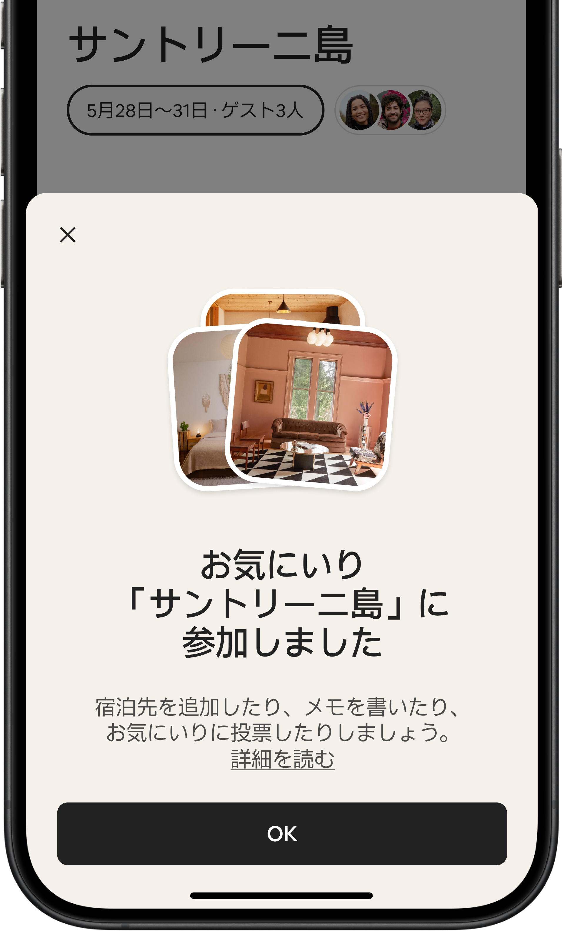 一緒に旅行するみんなでお気にいりを簡単に共有して、メモの追加、宿泊先の投票、旅行日程や宿泊人数の調整を行うことができるようになりました。また、ほかの人とお気にいりを共有すると、アプリによってお気にいりの作成が提案されます。