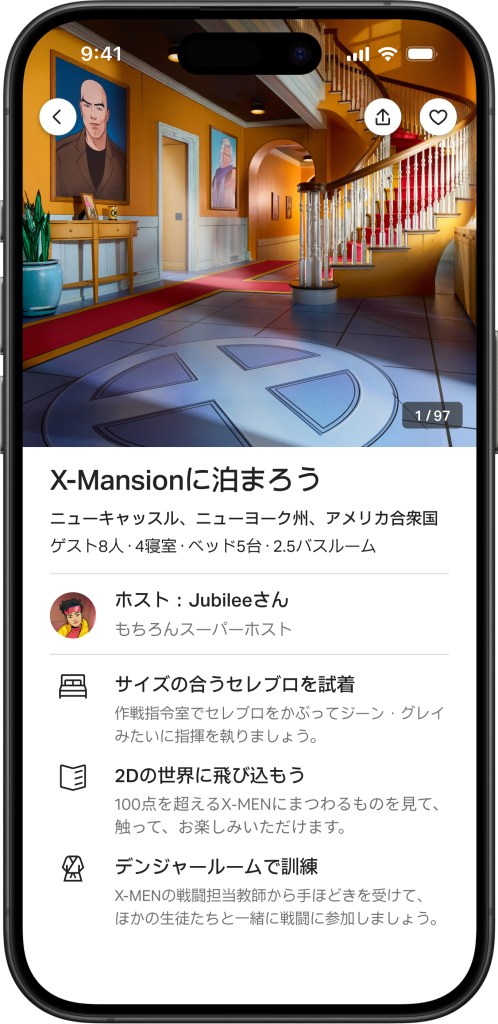 - 『X-MEN ’97』の世界に入り込もう ニューヨーク州ウェストチェスターにある、マーベルアニメーションによるX-Mansionを再現した建物に滞在して、X-MENのように過ごしましょう。あなたのミュータント能力を見つけ、デンジャールームで訓練することもできるでしょう。