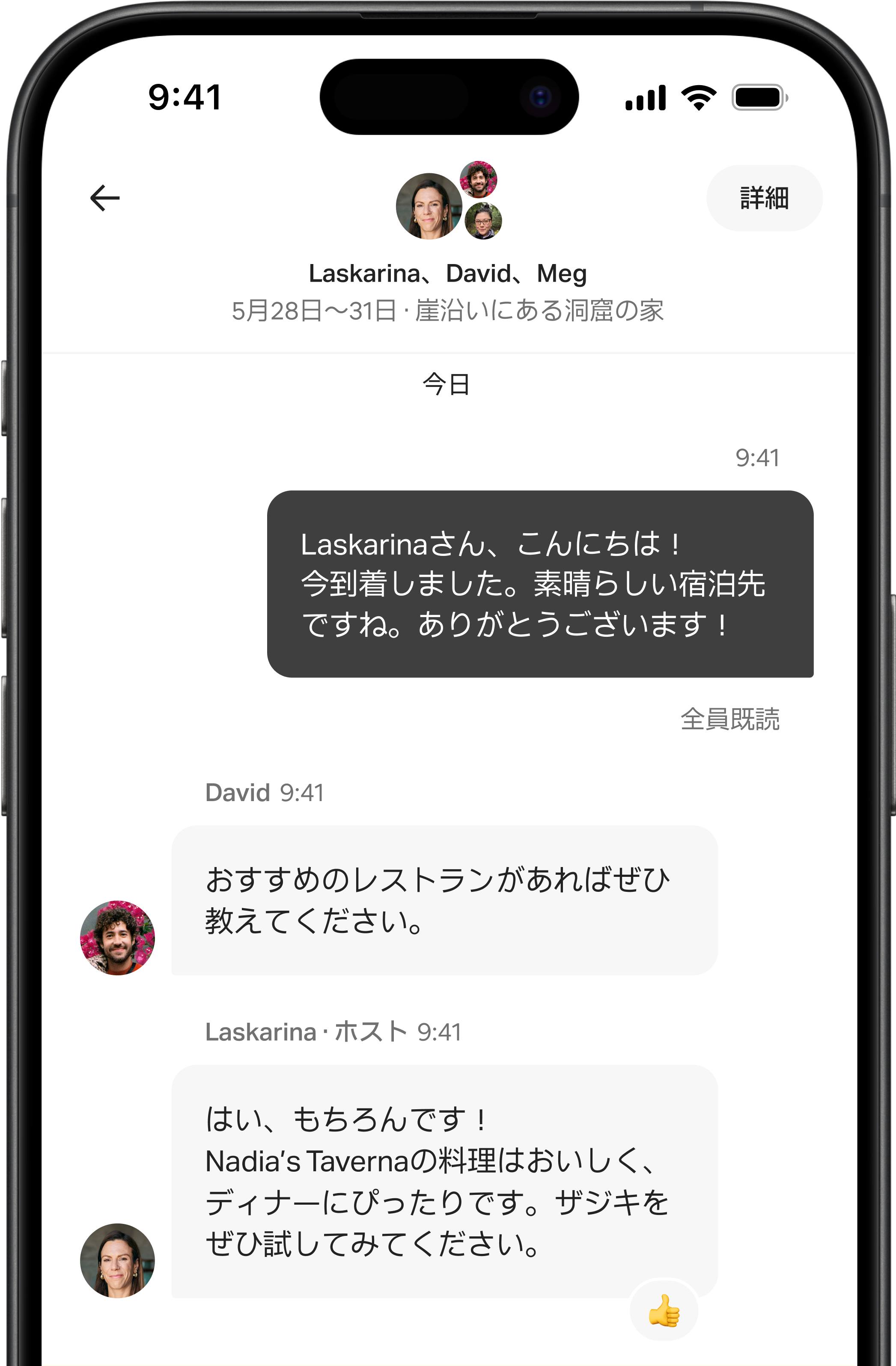 メッセージタブのデザインが一新され、旅行に参加する方全員がグループスレッドでホストとメッセージをやり取りできるようになりました。デザインがシンプルになり、ゲスト、ホスト、カスタマーサポートのメッセージがすべて一箇所に集約され、メッセージを簡単に検索できるようになりました。リアクション機能により、ゲストとホストは絵文字を使って反応することができます。また、AIによるクイック返信の提案により、ゲストからのよくある質問にホストが即座に返答できるようサポートします。