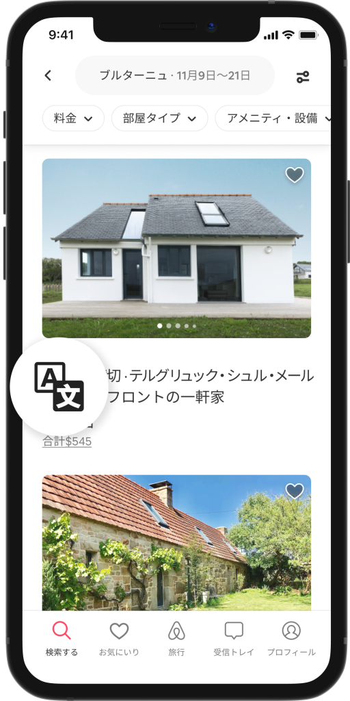国境を越える旅行が回復してきた現在、Airbnbの新しい翻訳機能によって、60以上の言語でホストとゲストにシームレスな体験を提供します。Translation Engineが、リスティングの説明やレビューを自動翻訳するので、都度ボタンをクリックして翻訳する必要がありません。評価の高い機械翻訳評価会社でAirbnbの上位10言語について翻訳の品質調査を実施したところ、Translation Engineの翻訳を通して、99%以上のAirbnbのリスティングの質が上がったと報告されています。Translation Engineは、何百万ものAirbnbデータポイントを使用して翻訳を改善しているため、新しいコンテンツから学習することで、時間の経過とともにさらにスマートになります。