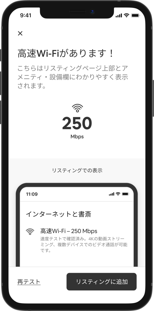 高速で信頼性の高いWi-Fiは、これまで以上に重要です。実際、今年のAirbnbのゲストは、Wi-Fi検索フィルターを2億8,800万回以上使用しています。ホストはAirbnbアプリから自身のリスティングのインターネット接続をテストし、Wi-Fiの速度を確認することができます。このアップグレードにより、オンライン会議システムやお気に入りのストリーミング番組も確実に利用することができます。
