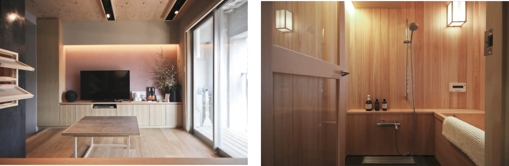 都心型ブランドホテルのスイートと同じサイズのお部屋にクイーンサイズのベッド、大型TVとミニキッチンを配したリビングルーム、そして自慢の檜材を使ったお風呂とで構成されています。東京駅に出入りする新幹線を眺めながら、湯船に浸かってみたり、銀座で買い物や食事をした後、たった徒歩5分でお部屋に戻れたり、質の高い内装デザインと、ホテルにはない利便性を兼ね備えたお部屋です。