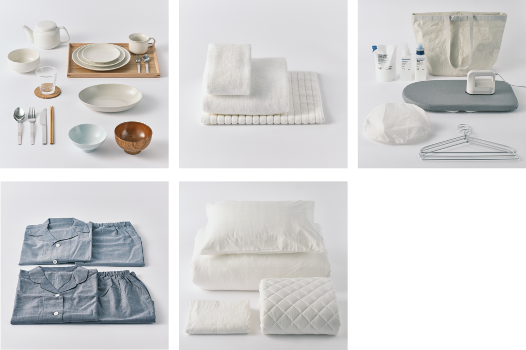 食器セットには、ステンレスカトラリー、木製トレー、ポットなどが含まれており、バス・洗濯セットにはふっくらパイルタオルやハンガーなどがあります。さらに、リラックスした宿泊に欠かせない寝具・パジャマセットもご用意しています。