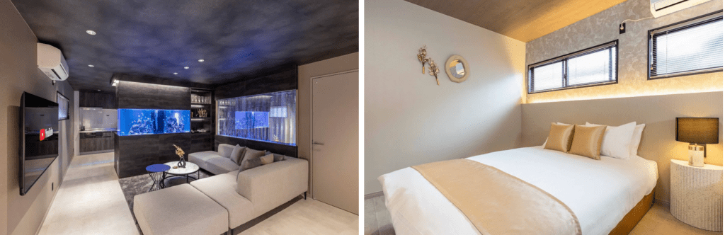 3LDK98㎡の2階建て一軒家を有名インテリアコーディネーターがデザイン。特に1階のアクアリウムでは水中をゆったりと泳ぐ魚をご覧いただけ、安らぎのお時間をお過ごしいただけます。すべてのお部屋は洗練されたデザインで贅沢な非日常空間を演出します。2〜9名までご宿泊可能です。ベッドは「シモンズ」製品で、寝心地の良さと品質にこだわり、ご滞在をより快適なものにいたします。