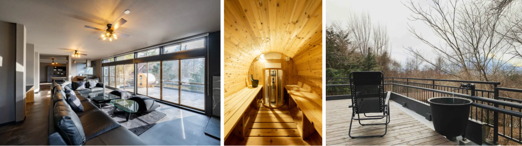 広々としたテラスがあり、BBQをお楽しみいただけるほか、大きな窓から眺望を楽しめるゆったりとしたリビングスペースやキッチンに隣接して窓から眺望が楽しめるサウナ付きバスタブスペースを完備。サウナで汗をかいたあと、すぐ横のバスタブを水風呂としてお使いいただけます。テラスでは外気浴専用のインフィニティチェアのご用意がございますので、美しい景色を見ながらととのっていただけます。