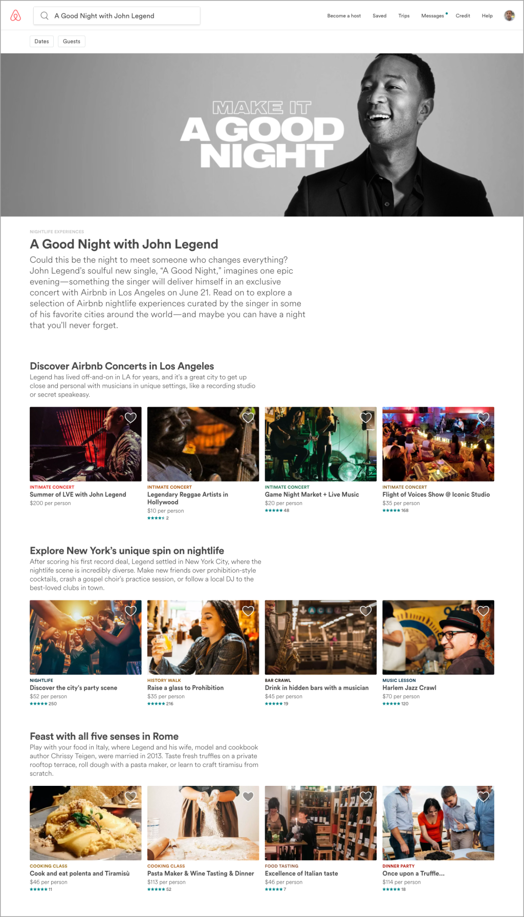 In addition we’re adding hundreds of concerts every month around the globe, and are on track to be in 50 cities and have 20,000 people booking Airbnb Concerts each month by the end of the year. To date, we’ve had performances ranging from up and coming artists to mainstream groups like ARIZONA and Vance Joy. And now, John Legend, who called Airbnb home during his tour last year, will be among the many to list a music event on the Airbnb platform, taking place in Los Angeles on June 21.