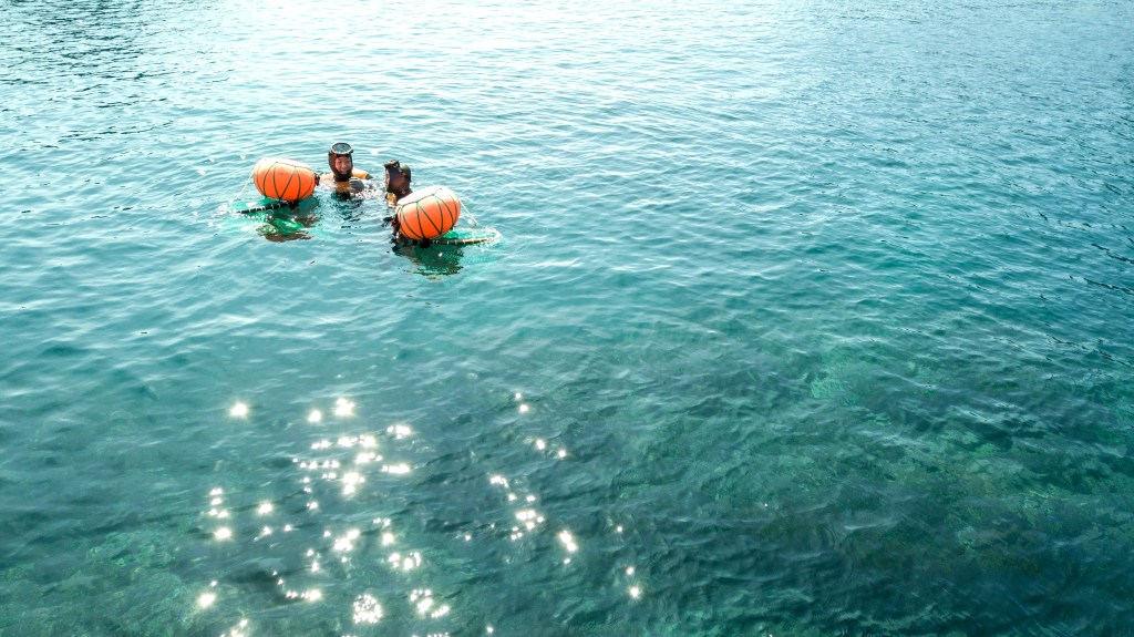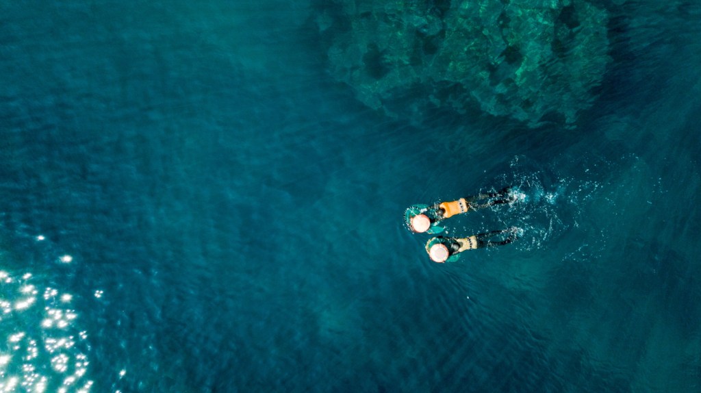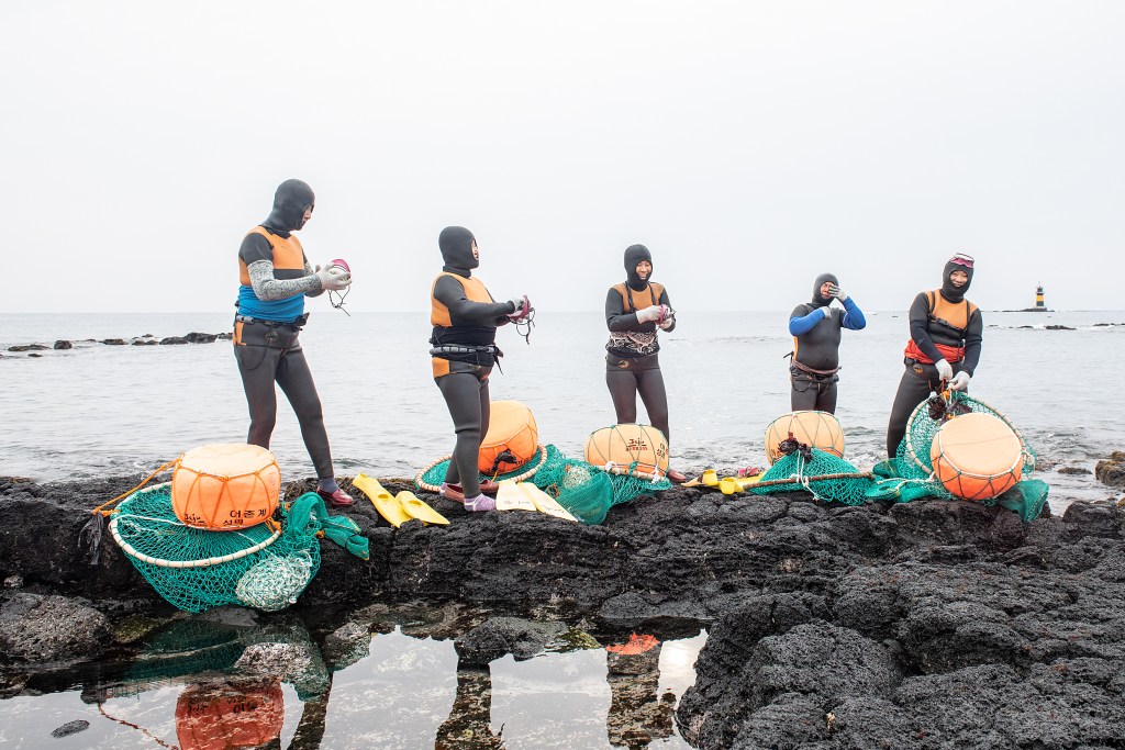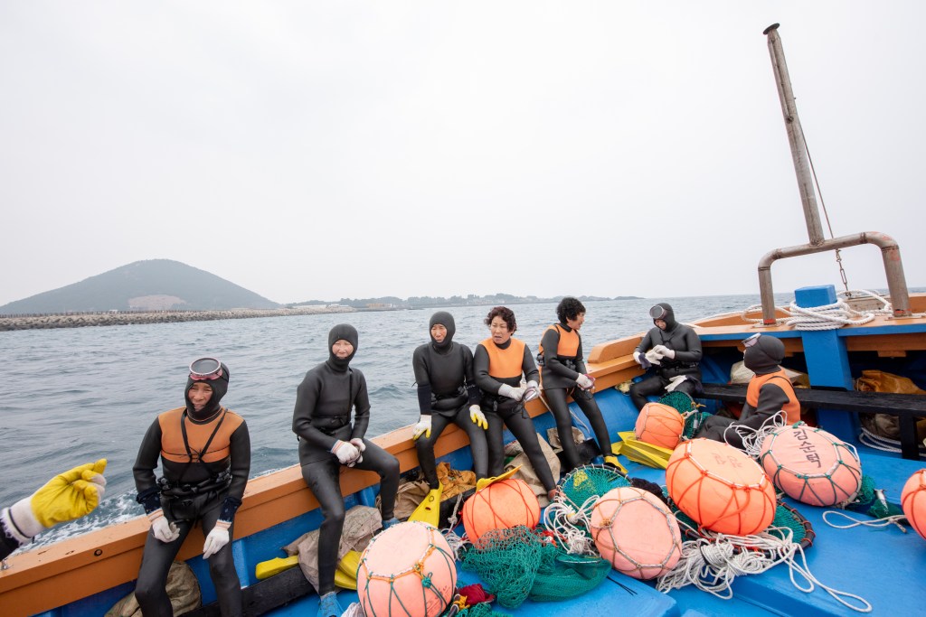 특별한 장비 없이 바닷속에서 해산물을 채취하는 제주 해녀는 유네스코 인류무형문화유산이다. 바닷가 해녀 탈의장에는 10대 시절 해녀에 입문했던 마을 동무들이 이제는 60-70대의 베테랑 해녀가 되어 모여 있다. 거친 파도가 가라앉기를 기다리며 따뜻한 난로 앞에 옹기종기 앉아 이야기를 나누다 물때가 되자, 해녀들은 고무잠수복을 입고 해산물을 담을 태왁을 메고 바닷속 깊이 잠수하기 위해 무거운 납벨트를 허리에 두른채 바다로 향한다. 파도가 치는 검은색 현무암에 앉아 수경을 쓰고 바다속에 몸을 담그자, 나이 들어 여기저기 쑤셨던 몸이 가벼워진다. 해산물이 더 많은 깊은 바다를 향해 한 명 두 명 힘차게 발길질을 하며 나아간다. 어느새 저 멀리 빨간 등대가 보이는 푸른 바다에 띄엄 띄엄 형광 오렌지색 태왁들이 점점이 떠있고, 해녀들이 바다로 들어가는 발길질이 일으키는 하얀 물결이 보인다.