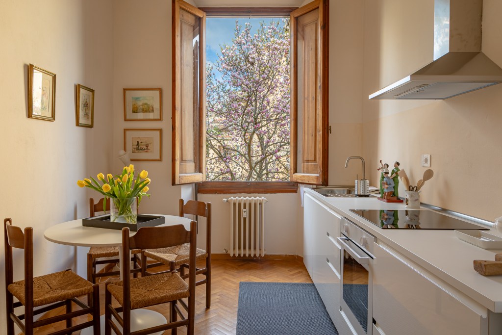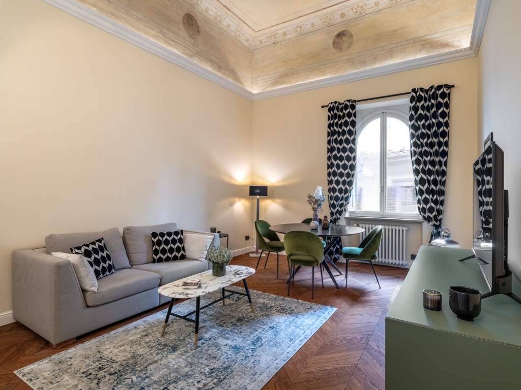 유서 깊은 19세기 건물 5층에 위치한 독특한 펜트하우스 스타일의 숙소는 피렌체 전경이 한눈에 내려다보이는 뛰어난 전망을 자랑한다. 내부는 고풍스러운 가구와 고급 인테리어 소품으로 꾸며져 클래식한 분위기를 더하며, 피렌체의 대부분의 관광지가 도보로 5-10분 거리에 위치해 있어 ‘추석살기’를 하며 피렌체 구석구석을 탐방하려는 여행자에게 최적이다. 인근에는 유서 깊은 카페들과 레스토랑이 있어 현지의 미식과 분위기를 동시에 경험할 수 있다.