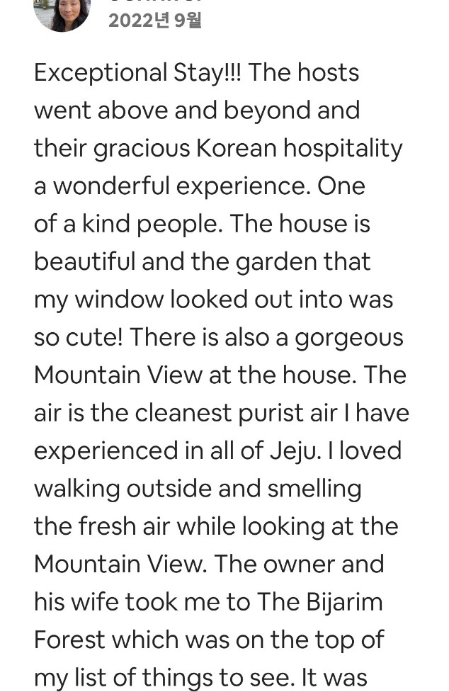 가장 기억에 남는 게스트로 미국인 제니퍼 이야기도 빠질 수 없습니다. 제니퍼가 숙소로 돌아와 서귀포에서 깡패로 보이는 남자들이 자기 배낭에서 휴대폰을 훔쳐 갔다고 했습니다. 제가 상황을 들어봤더니 휴대폰을 도난당한 것이 아니라 버스에서 분실한 것이라고 판단이 됐습니다. 직접 경찰서와 버스 회사에 전화하고 방문하며 결국 시내버스 회사 유실물 센터에 보관된 제니퍼의 휴대폰을 찾아줬습니다. 저의 귀여운 오지랖에 감동했는지 제니퍼는 별점 5개와 영어로 작성된 길고 긴 후기를 남겨주었습니다.