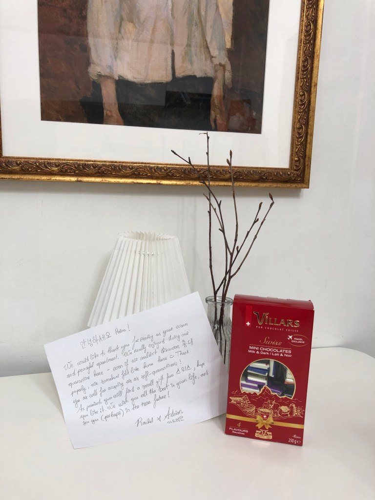 프랑스인 게스트가 체크인 할 때 핫팩을 선물로 줬는데, 게스트가 본인도 선물을 준비해 왔다면서 가방에서 제 선물과 공항에서 쓴 손 편지를 주더라구요. 이미 비용을 지불한 게스트가 선물을 준다니 조금은 부담스러울 수 있는데, 사실 너무 고마웠다고 말하는 게스트를 보니 너무 행복하고 뿌듯했습니다. 여행을 끝나고 체크아웃 하는 날도 제 덕에 즐거운 한국 여행이 되었다며 감사하다고 쪽지를 남겨 주었답니다.