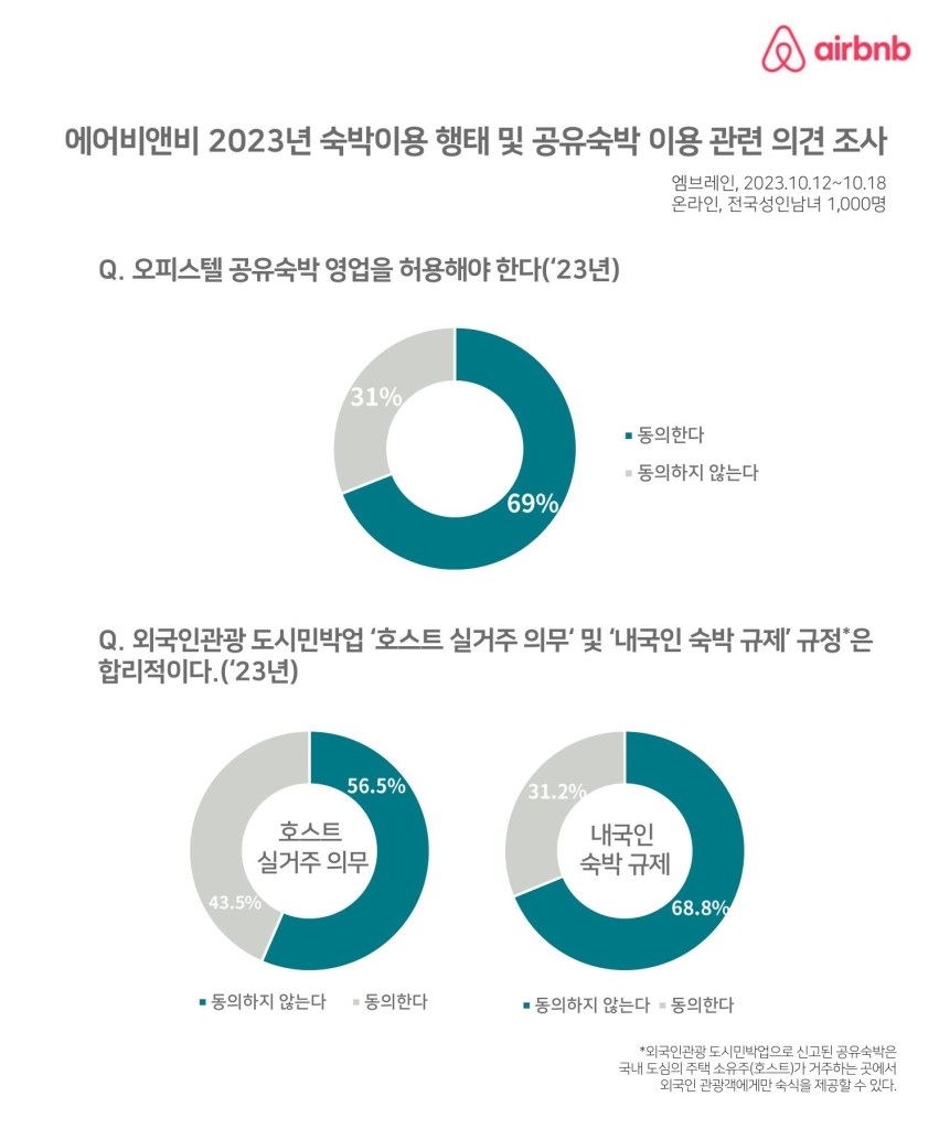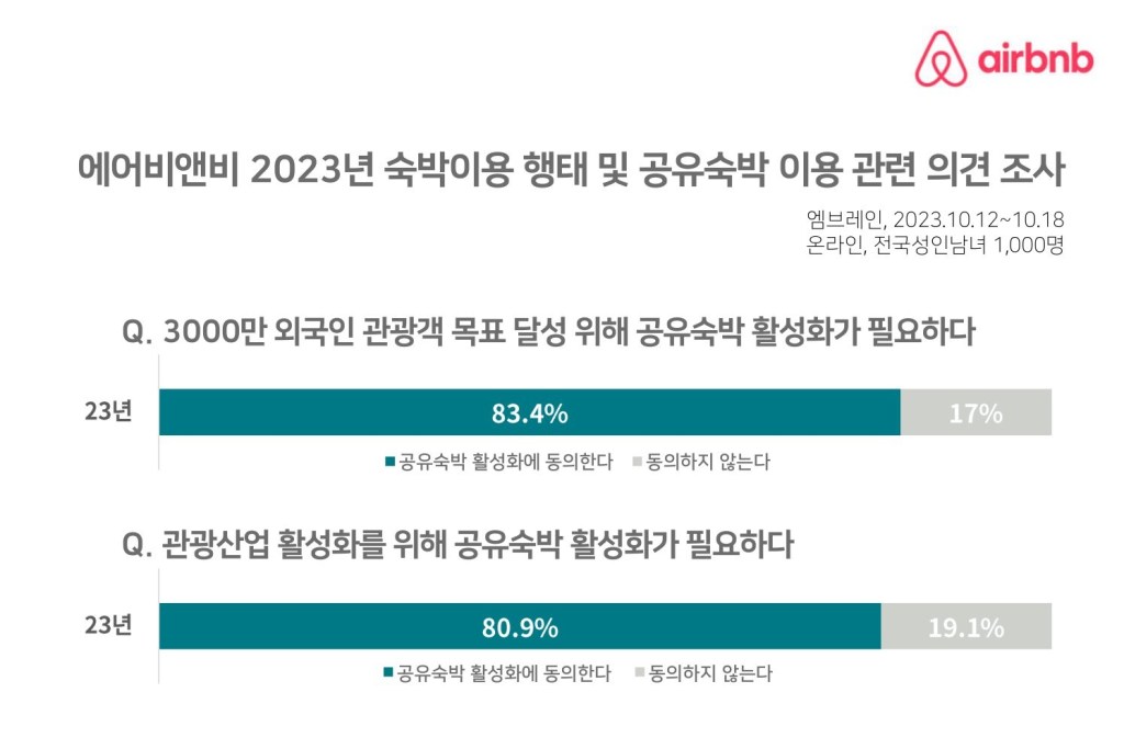에어비앤비가 시장조사전문기업 엠브레인에 의뢰해 지난해 10월 전국의 성인 1,000명을 대상으로 진행한 온라인 설문조사에 따르면, 조사에 응한 응답자 83%는 외국인 관광객 3,000만명 돌파라는 목표 달성을 위한 과제 중 하나인 숙소 부족 문제 해결을 위해 공유숙박업 활성화가 필요하다는 데 동의한다고 밝혔다.