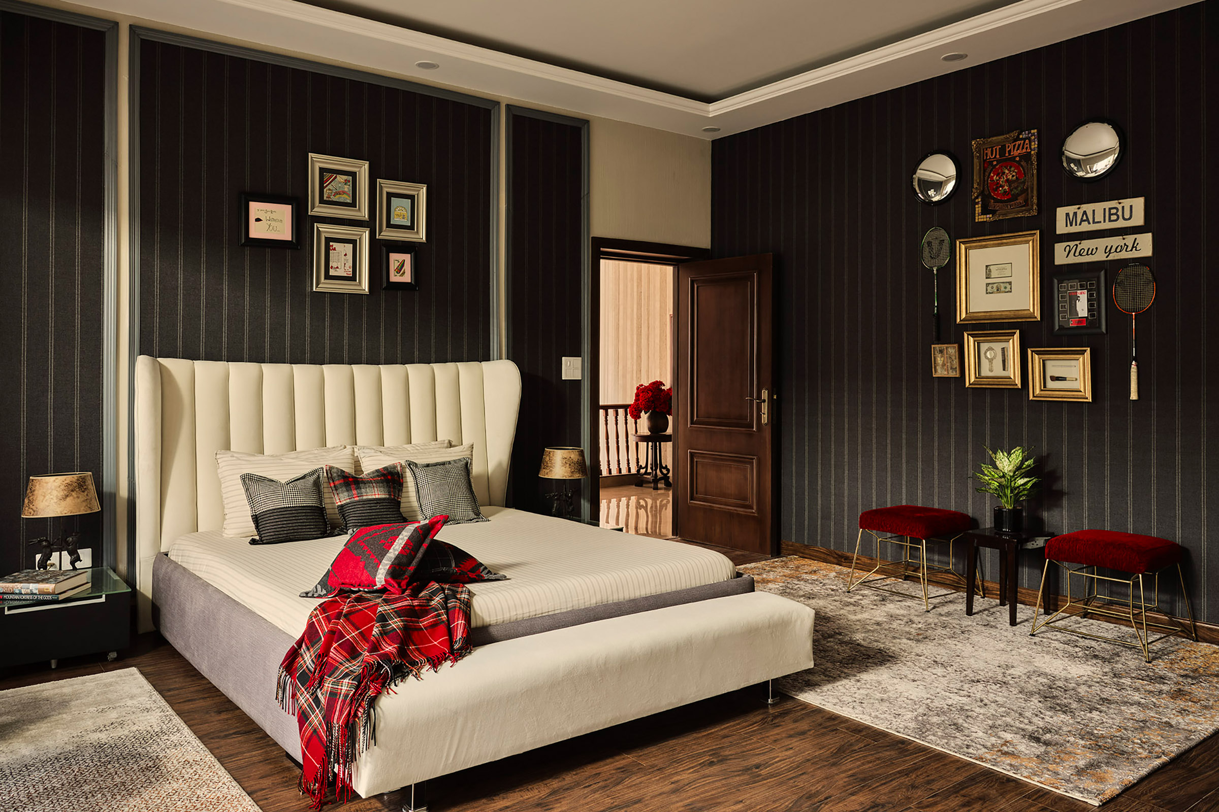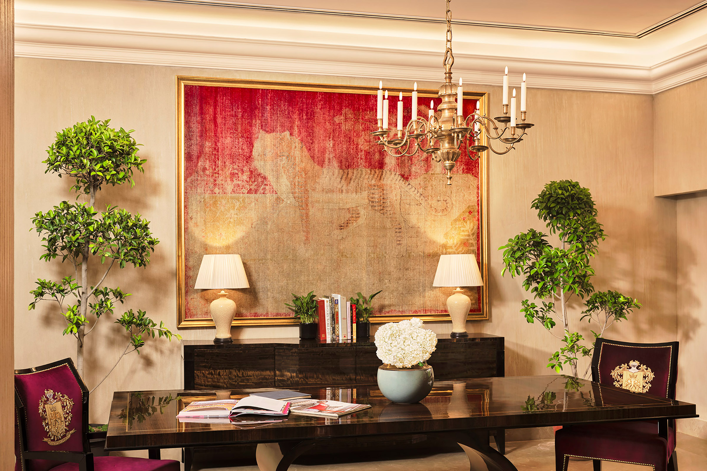 An oasis of peace in bustling Delhi, the Khan home is marked by bold hues, an abundance of warm, natural light from many windows and an impressive art collection. Richly textured walls, colorful tapestries, and glittering chandeliers cast an inviting glow. Floor-to-ceiling French doors open to an expansive garden filled with flowers of many hues. The most telling design element, however, is a deeply personal aesthetic that captures the family’s many memories over the years. Photographs and knick-knacks line a wall in the master bedroom – son Aryan’s first badminton racket; daughter Suhana’s make-up brushes and the butterflies she collected; son AbRam’s first birthday gift of an exquisite silver mirror and comb; original negatives of Shah Rukh Khan’s favourite film. Another wall is adorned with the handmade cards exchanged by Shah Rukh and Gauri during their early days of courtship. It is these personal touches, more than anything, that make this house such a welcoming place to call home.