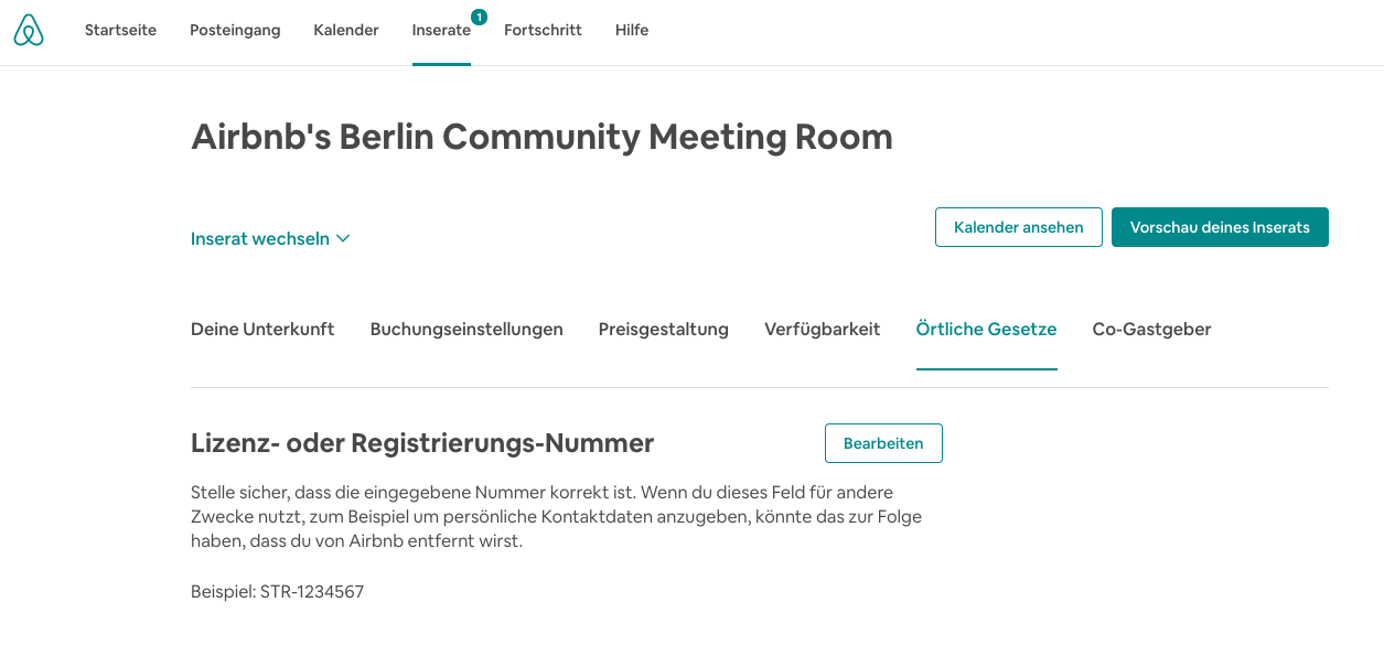 - Gemeinsam mit deiner Genehmigung erhältst du eine Registriernummer. Diese musst du ab dem 1. August in deinem Inserat sowie bei jeder Form der Bewerbung deines Inserats angeben. Bei Airbnb wirst du in deinem Dashboard ein für die Registriernummer vorgesehenes Feld finden (siehe Screenshot)