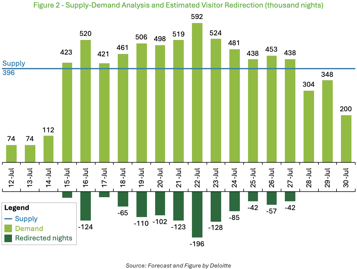 Deloitte’s analysis projects exceptionally strong demand for accommodations in Los Angeles County and Orange County, with up to 320,000 visitors seeking additional lodging options across peak days.