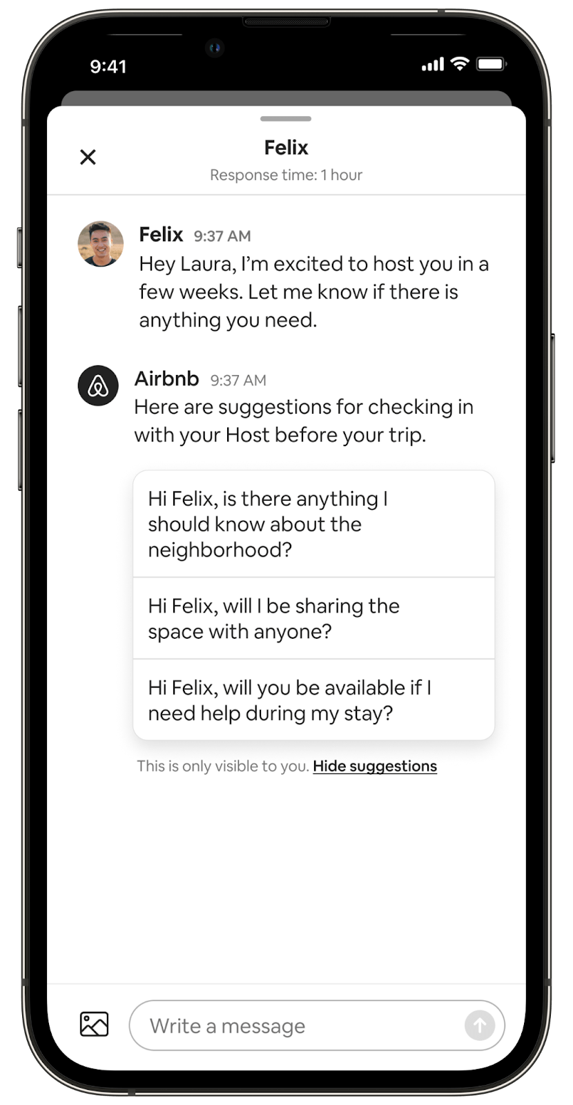 Once the reservation is confirmed in the message thread with the Host, the traveler will see automated prompts by Airbnb suggesting questions to ask the Host about the listing and surrounding neighborhood. These suggested questions stem from research with experienced solo travelers who provided detail on the types of local insights that helped them stay safe while on the road.