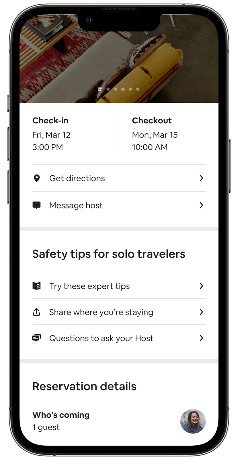 Our new Solo Traveler in-app experience is specifically designed to better support safe solo traveling on Airbnb. When a solo guest books a private or shared room reservation, we will activate a specialized in-app experience, starting with supplying the traveler with expert tips they may want to try to help stay safe when traveling alone.