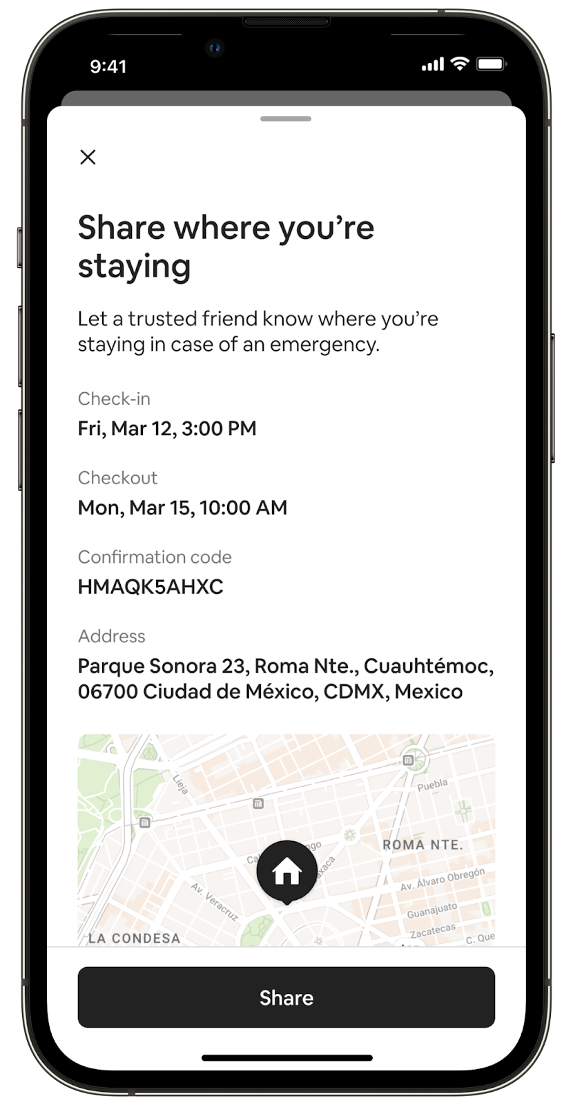 The key component of this new feature is the ability for the solo traveler to easily share, with one-touch, their reservation itinerary with the important and trusted people in their lives for added peace of mind and in the rare event of an emergency during a stay. The itinerary includes: listing address, reservation code, and check in and out dates.