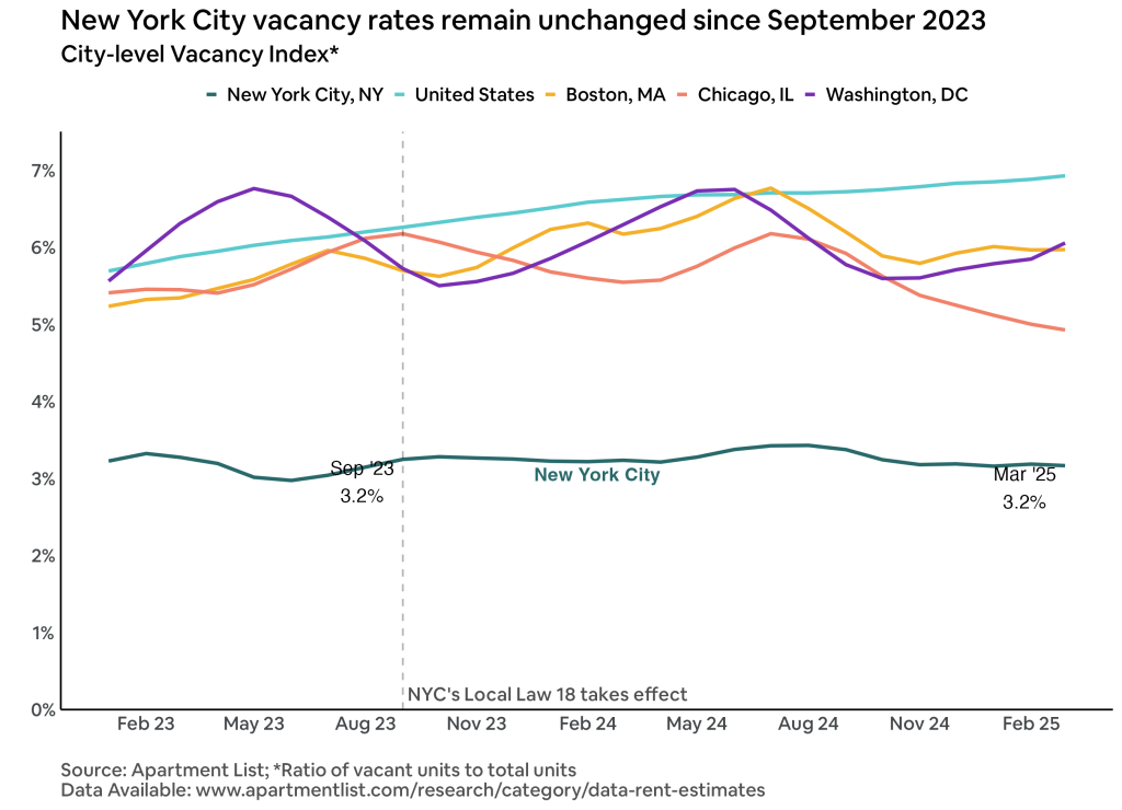 - More than 20 months later, New York City's Local Law 18 has failed on its promise of improving housing availability and affordability. For the first time on record, the median rent across all of Manhattan has surpassed $4,000 per month – a 4.1 percent increase since the law took effect – and vacancy rates remain unchanged.
