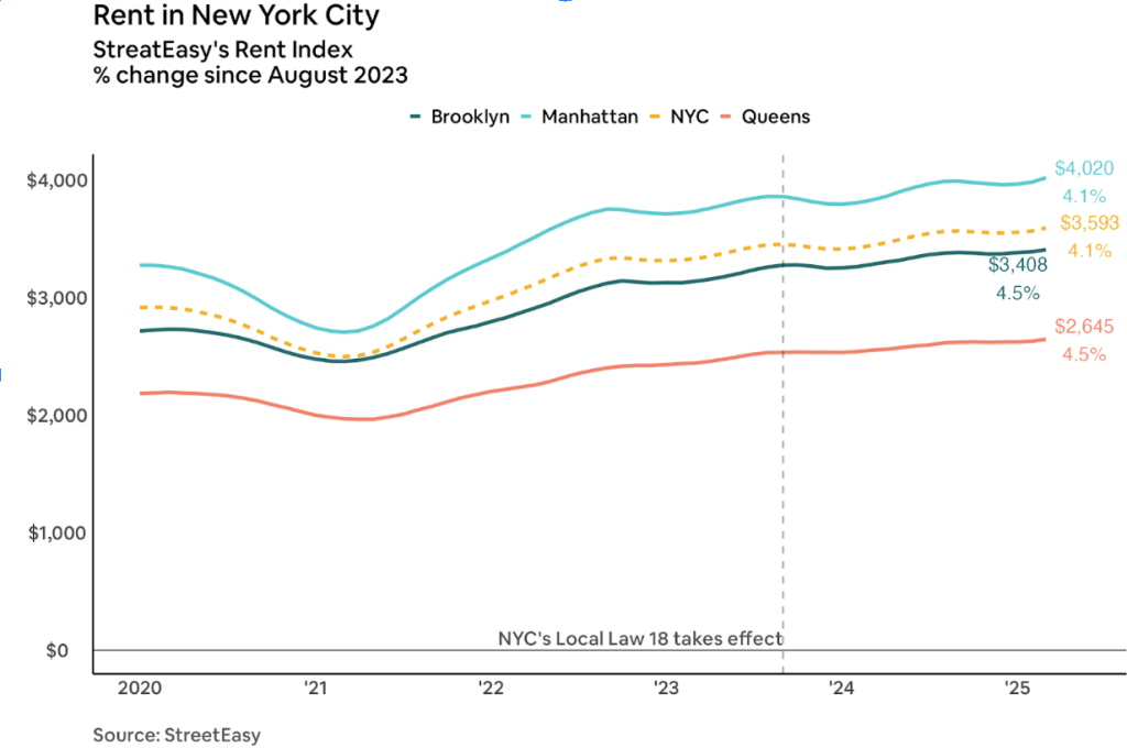For the first time on record, the median rent across all of Manhattan has surpassed $4,000 per month, according to StreetEasy – a 4.1 percent increase since the law took effect. Citywide, the upward trend continues with rents rising around five percent, including in Brooklyn and Queens, cementing New York City’s place as one of the most expensive cities in the world.
