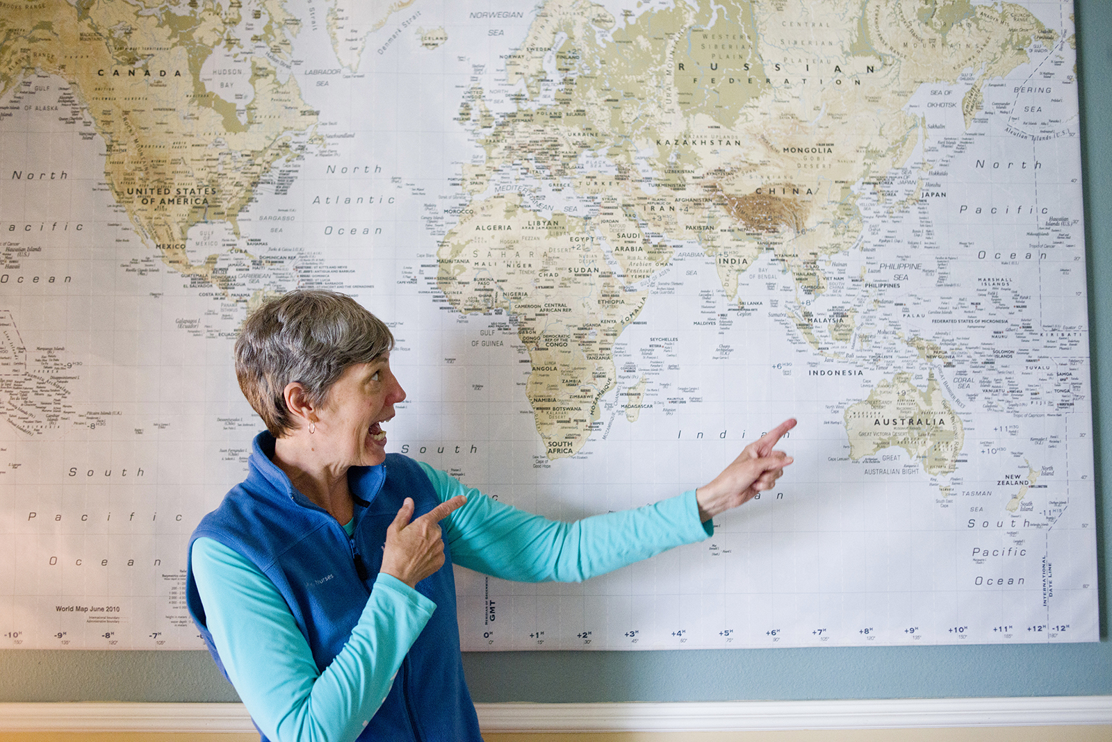 Sarah always takes a picture with her guests in front of her wall-sized world map.