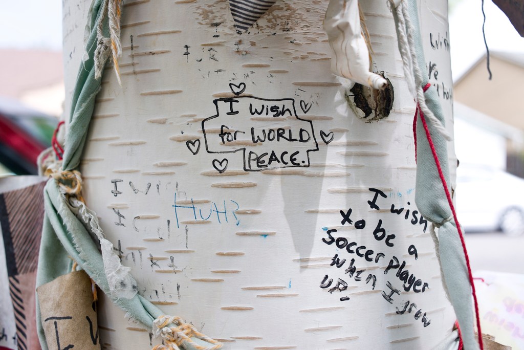 “Yep, that’s my tree — planted it 13 years ago,” she says of the bleach-white birch dressed in a coat of handwritten notes. “Kids love writing wishes and hanging them on the branches. On sunny days it gets mobbed and I have to restock the paper almost daily.”