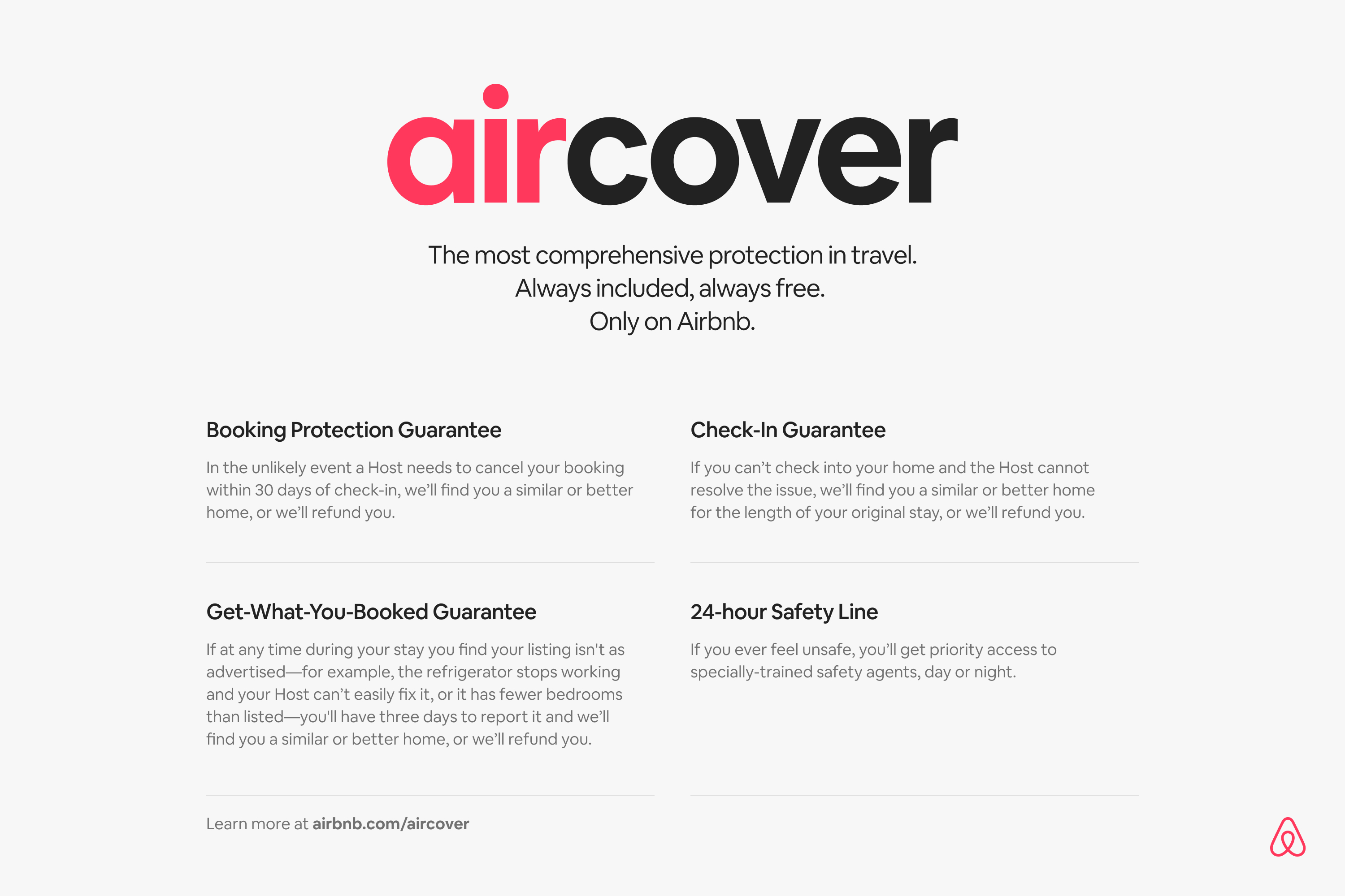 Find complete details on how AirCover protects every guest’s booking and any exclusions that apply. If you’re a Host, learn more about what AirCover means for you.